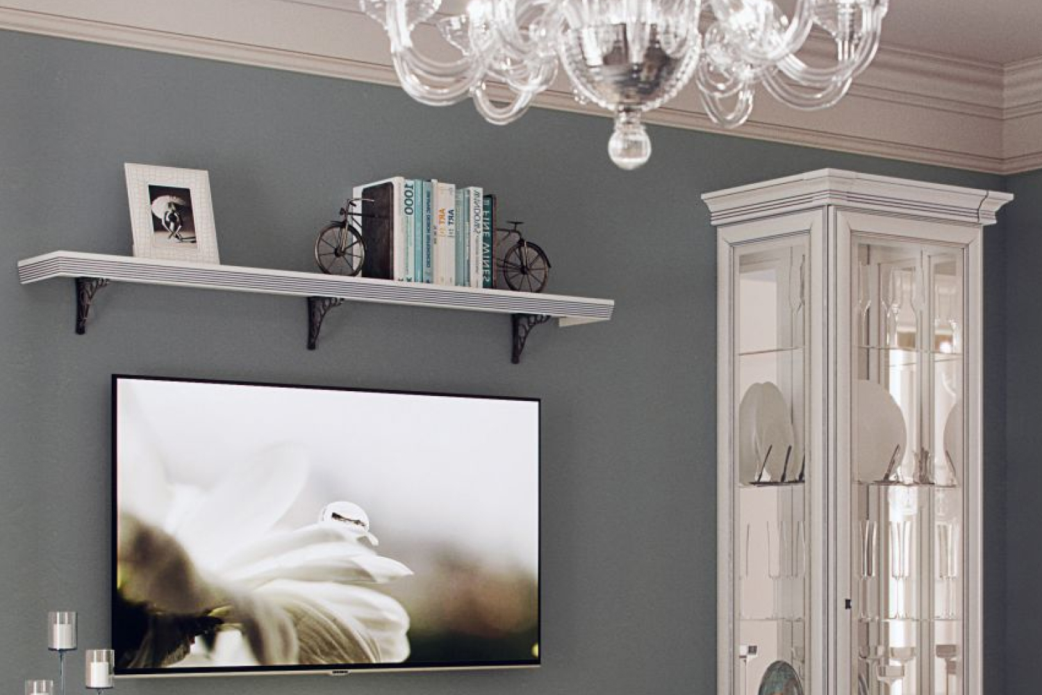 Лакированное покрытие в сочетании с патиной придает мебельному набору идеальную гладкость и блеск, защищает о воздействия солнечного ультрафиолета. Гостиная выполнена из долговечной, экологичной древесной плиты. Качественная фурнитура, изготовленная в оттенке «античное серебро», обеспечивает бесшумное, плавное движение всех элементов. Застекленные фасады, внутренние зеркальные стенки, чистый белый цвет преображают, визуально увеличивают комнатное пространство.