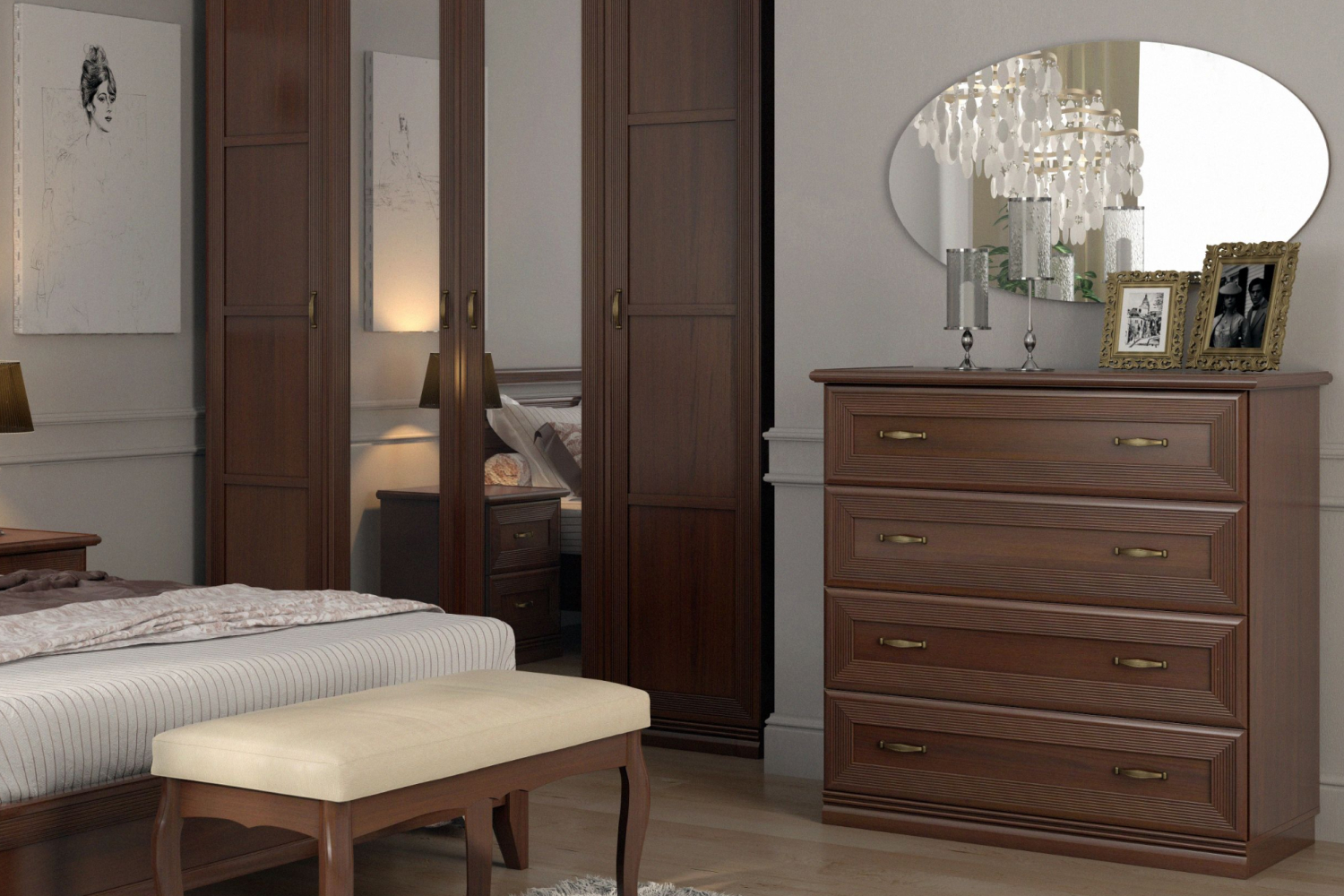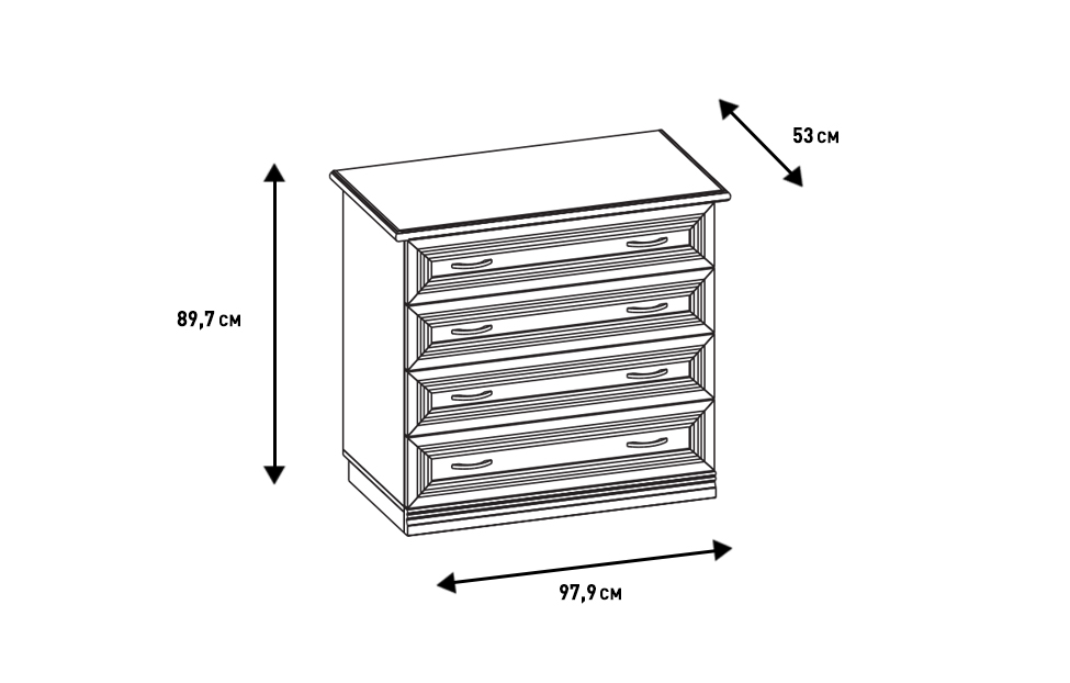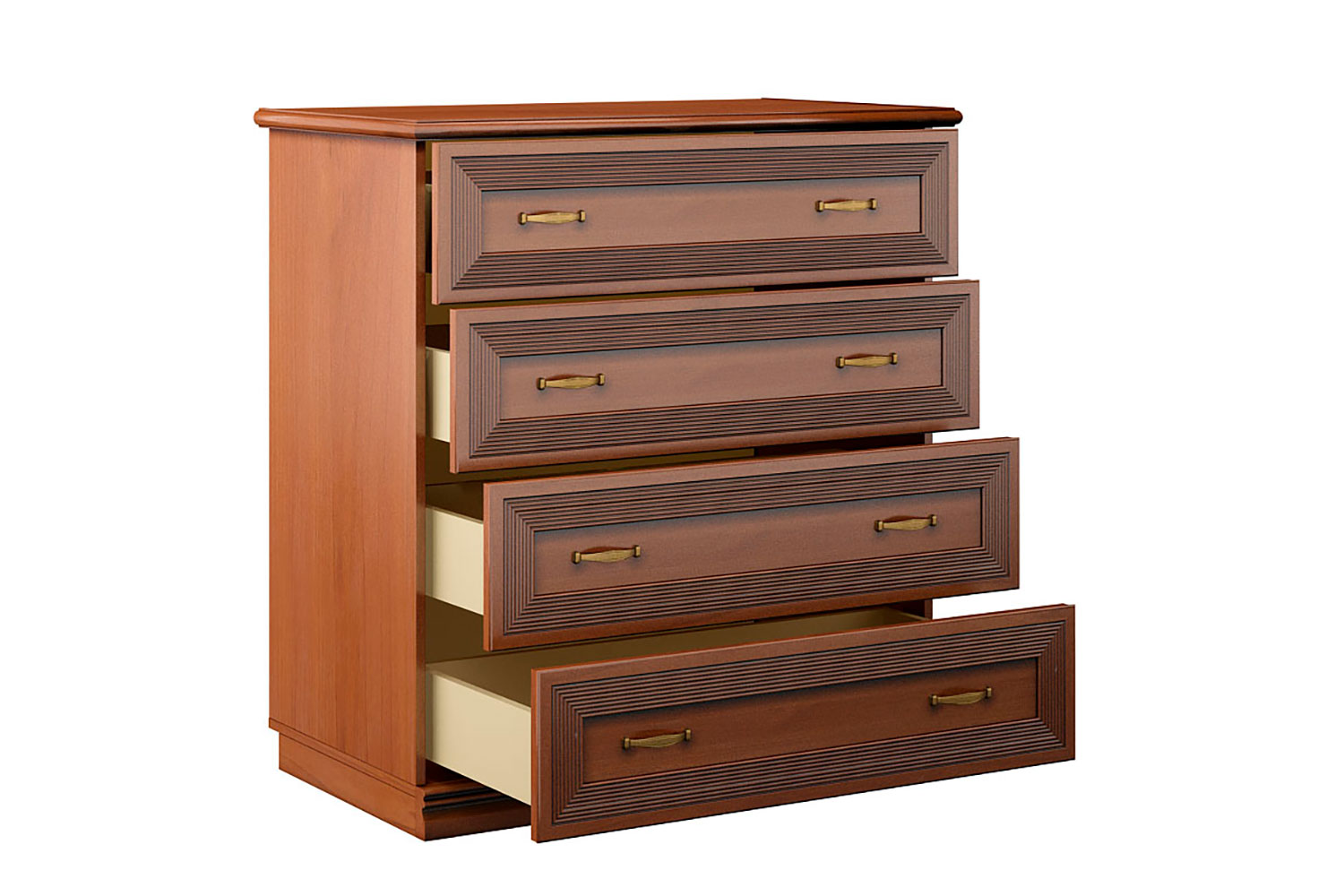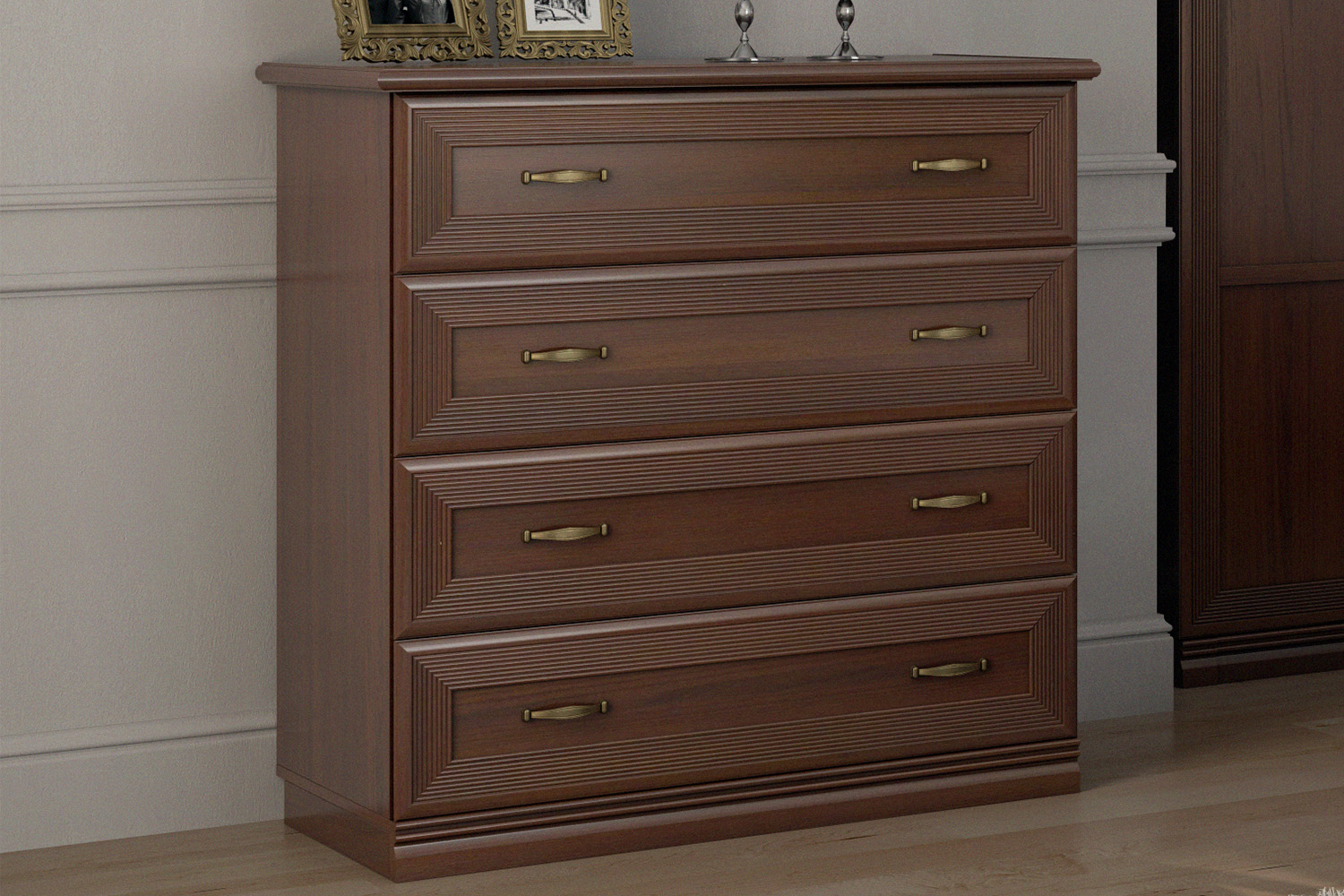 Изящный комод отличается чистотой линий и простотой исполнения. Главные декоративные элементы — фрезерованные филенки и невысокий цоколь. За счет лаконичного вида, легкости форм изделие прекрасно впишется в любой классический и неоклассический интерьер.