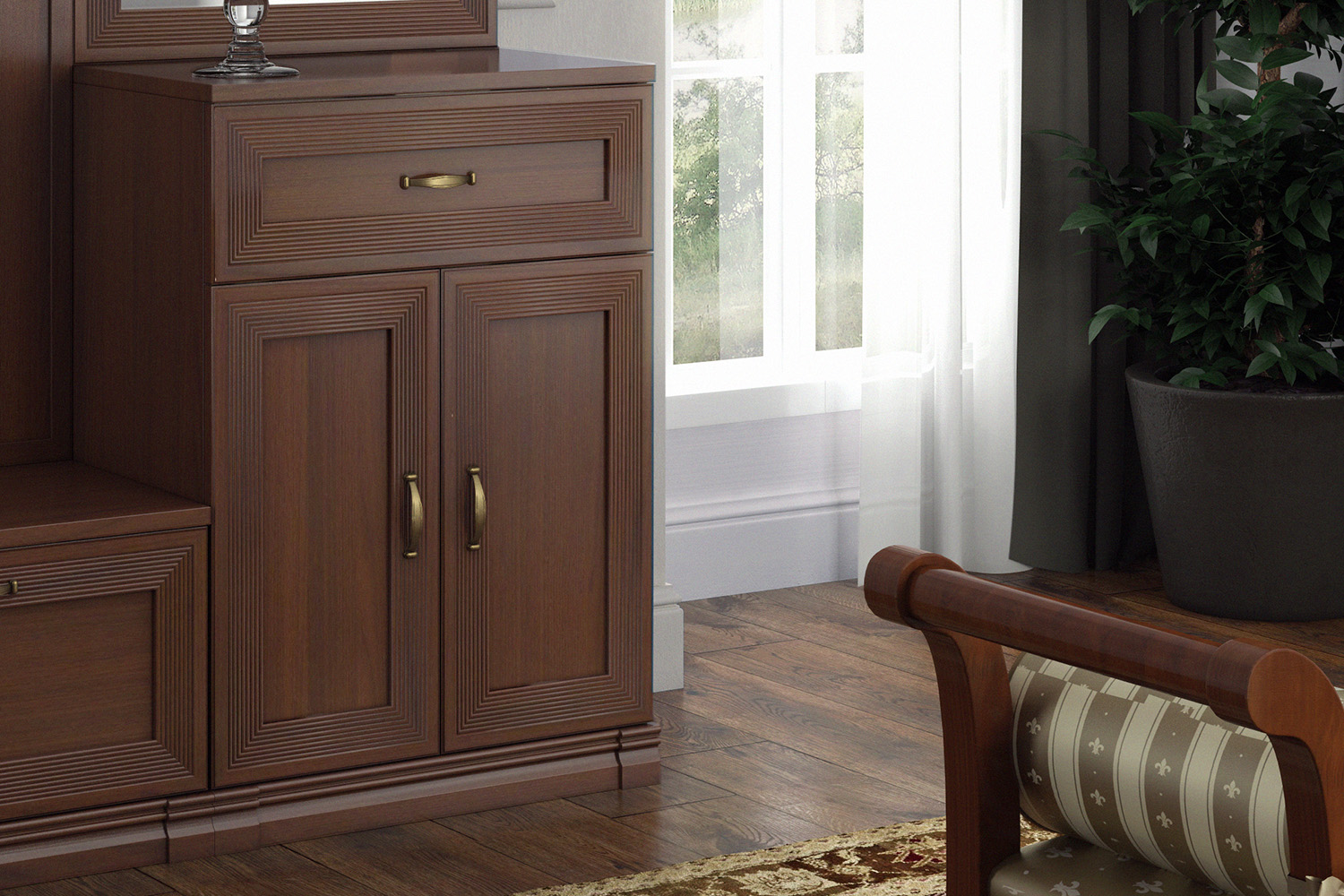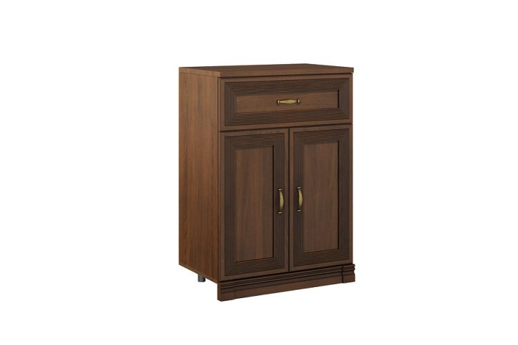 - Тумба с выдвижным ящиком и полкой ЛДСП за распашными фасадами;