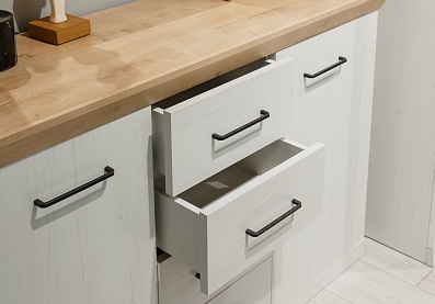 - В выдвижных ящиках используются направляющие скрытого монтажа со встроенным доводчиком. Это позволяет легко и почти бесшумно выдвигать-задвигать ящики, а также обеспечивает надежную фиксацию ящика и гарантирует длительный срок службы даже при высокой нагрузке.