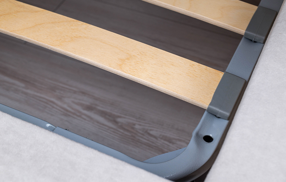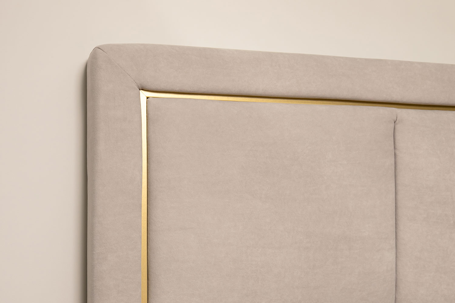 Обивка стильного оттенка «серый кашемир» выполнена из практичного и износостойкого микровелюра. Высокое изголовье простегано декоративной строчкой, украшено по периметру золотой окантовкой. Каркас изделия изготовлен из ламинированной ДСП. Мягкая отделка сводит риск травматизации в ночной атмосфере спальни к минимуму. Упругие ламели ложа обладают ортопедическим эффектом. Металлические ножки-опоры окрашены порошковой краской в серый цвет.