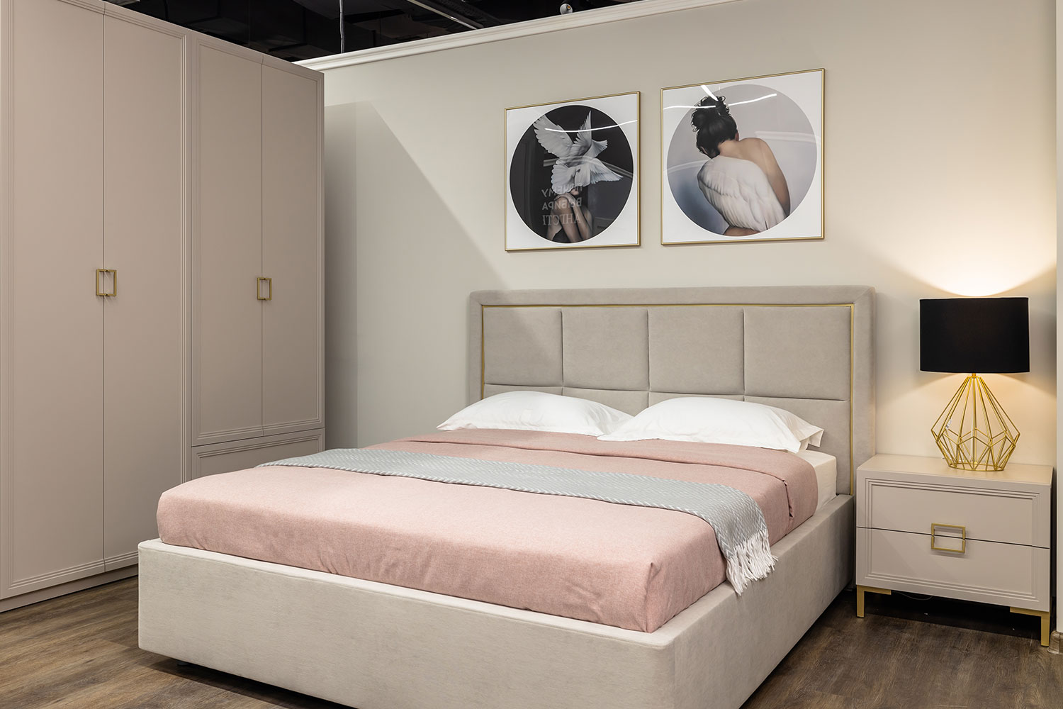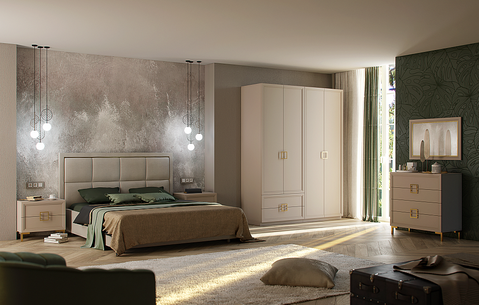 - Спальня Дольче выполнена в стиле эклектики, а также соединяет в себе стиль ар-деко в современном прочтении и минимализм. К строгим формам и безупречной геометрии добавлена гладкая текстура кашемира, позволяющая смягчить декор и подарить коллекции шлейф тонкой роскоши с золотыми вставками;
