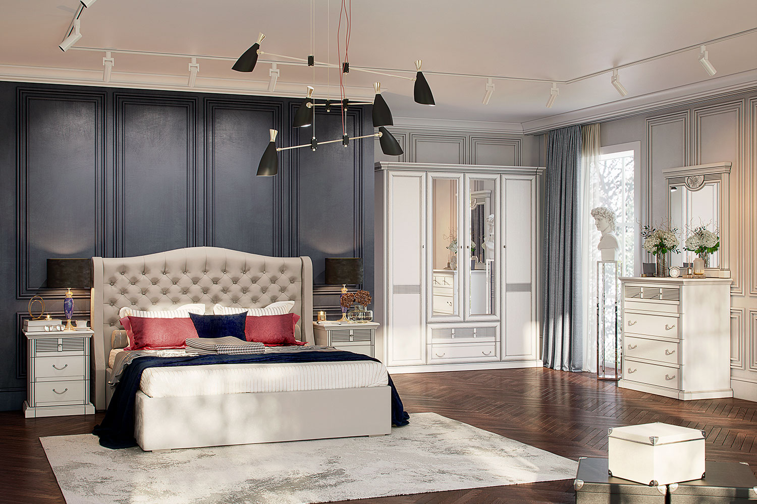 • Спальня Изотта понравится тем, кто ценит традиции и хочет подчеркнуть свой вкус и статус. С таким интерьером так и хочется проснуться пораньше, чтобы насладиться утренним кофе, новостями и спокойной, неспешной атмосферой вокруг, а приходить в спальню после тяжелого рабочего дня — настоящее удовольствие!