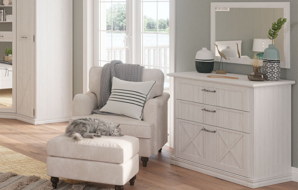 - Спальня в классическом стиле. Кантри — одна из любимых коллекций наших клиентов. Такая мебель подойдет к интерьерам в стилях прованс, кантри или сканди. При создании этой коллекции наш дизайнер вдохновлялась самобытной архитектурой Германии с ее характерной фахверковой системой;