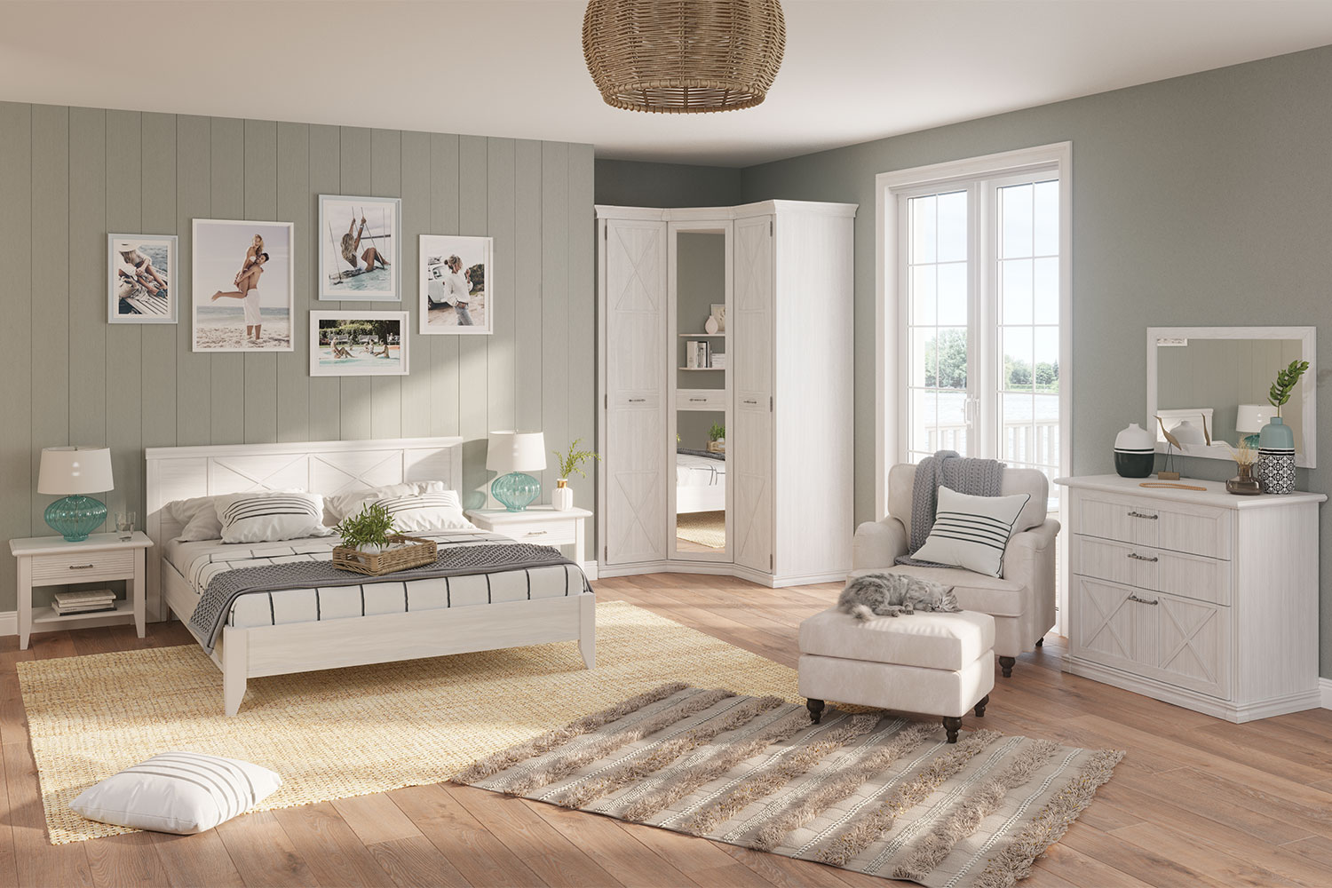 Классическое оформление спального гарнитура никогда не утратит своей актуальности. Мебельный комплект с традиционным дизайном идеально впишется в стиль кантри, прованс, неоклассика или сканди. Центральное место в помещении займет двуспальная кровать с высоким жестким изголовьем, декорированным накладками-фахверками. Вместительные системы хранения — два шкафа-пенала и угловой шкаф с зеркальным фасадом — помогут рационально организовать пространство и облегчат процесс сборов. Для размещения мелких аксессуаров подойдут прикроватные тумбы. В комплект также входят карнизы, цоколи и обрамленное минималистичной рамой зеркало.