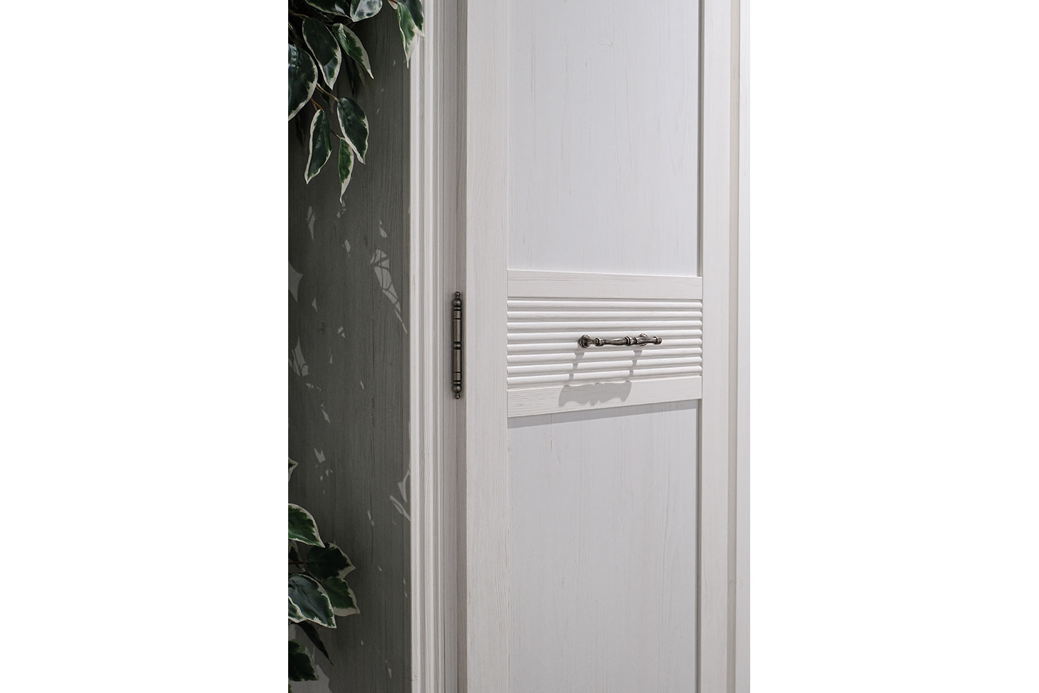 Мебель выполнена в оттенке «блан-шене», который прекрасно будет выглядеть на фоне как приглушенного, так и яркого окружения. Фурнитура имеет черное покрытие цвета «античное железо». Рамочные фасады, высокие скошенные ножки, изящные фахверки визуально облегчат корпусные предметы интерьера.