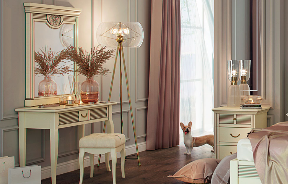 Для завершения интерьера вы можете дополнительно подобрать винтажную (или околовинтажную) мебель. Например, изящную банкетку или кресло из бархата или кожи с каретной стяжкой. Если же вы склоняетесь в сторону эклектики — обратите внимание на минималистичные аксессуары. Не забудьте про туалетный столик, который сделает утреннюю рутину еще комфортнее.