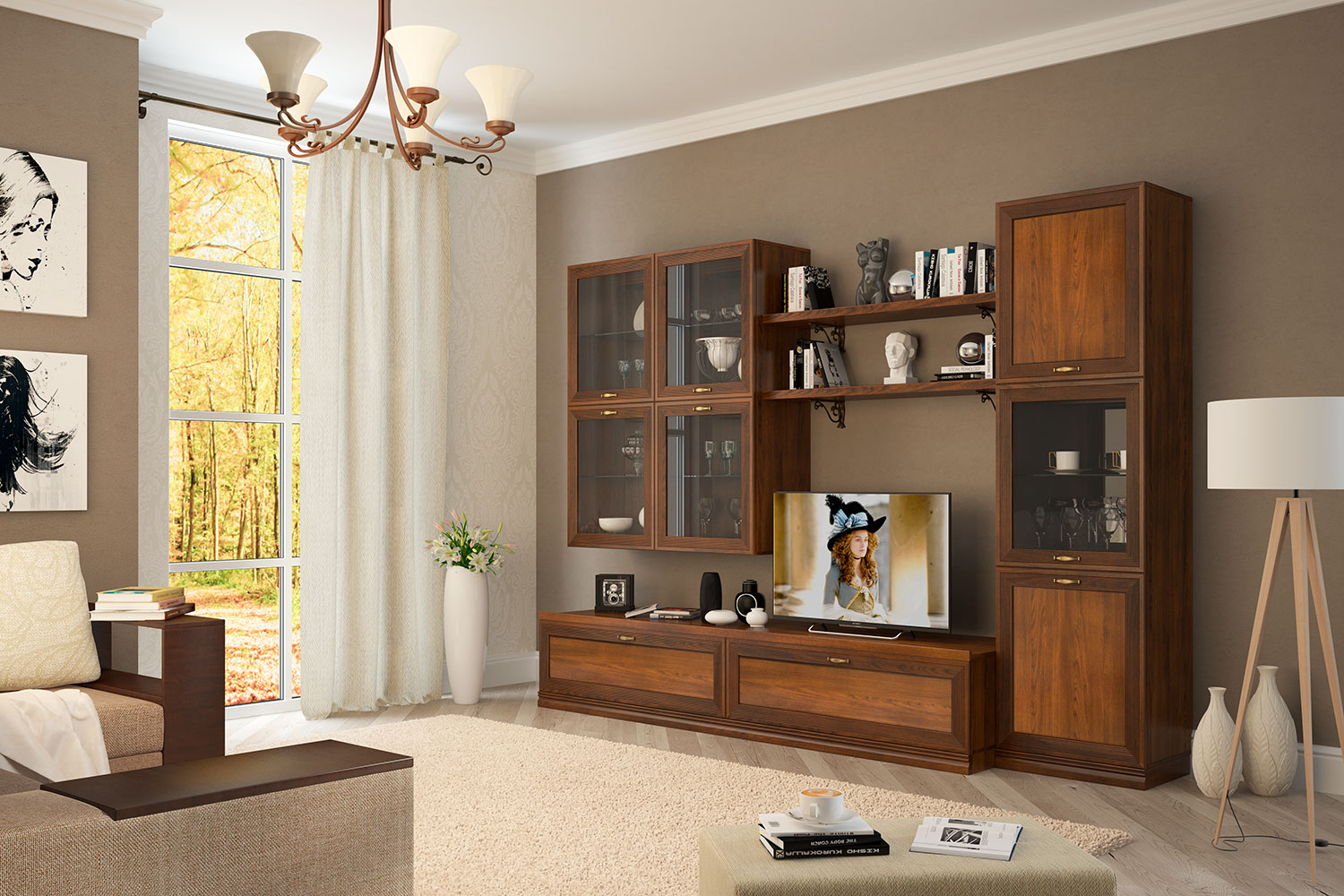Для создания еще более гармоничного интерьера в гостиную можно дополнительно подобрать кремовый или темный диван классических форм, изящный журнальный столик со стеклянной поверхностью. Если же вы хотите совместить гостиную с рабочей зоной — не забудьте про стол на высоких ножках и мягкое кресло с текстурной обивкой.