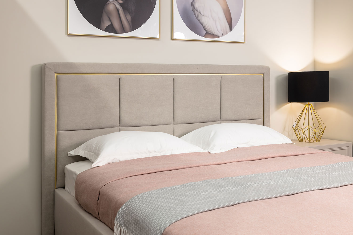 - Декоративная акцентная рама в изголовье кровати повторяет форму ручек.