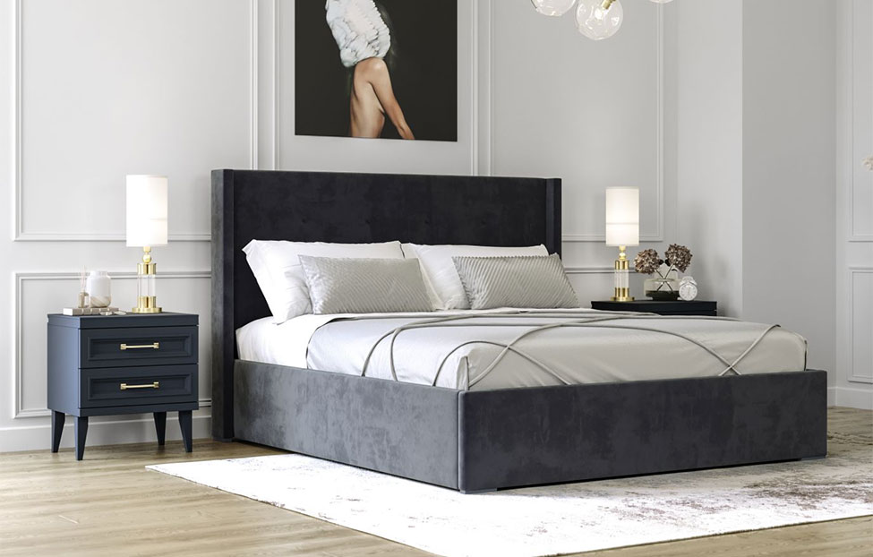 - Детали кровати обтянуты тканью Avelina (9852), изголовье декорировано пуговицами;
