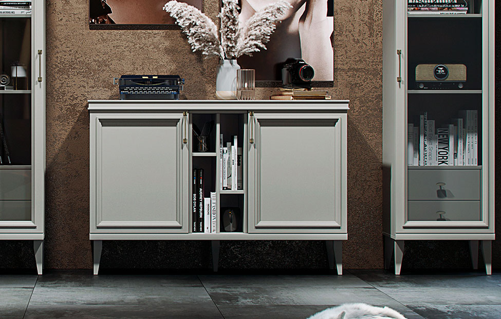 - Комод с тремя секциями: средняя секция — с двумя полками, за распашными фасадами — по одной съемной щитовой полке;