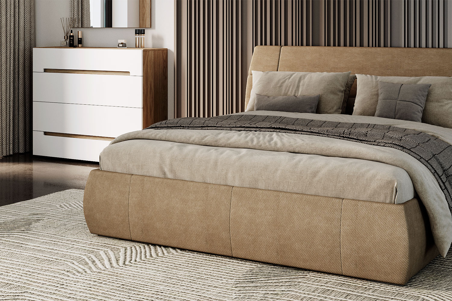 - Мягкий каркас кровати выполнен из ППУ, синтепона и спанбонда. Изголовье, передняя и боковые царги кровати обтянуты мягким велюром. Он легко поддается чистке и позволит чувствовать себя в кровати комфортно;