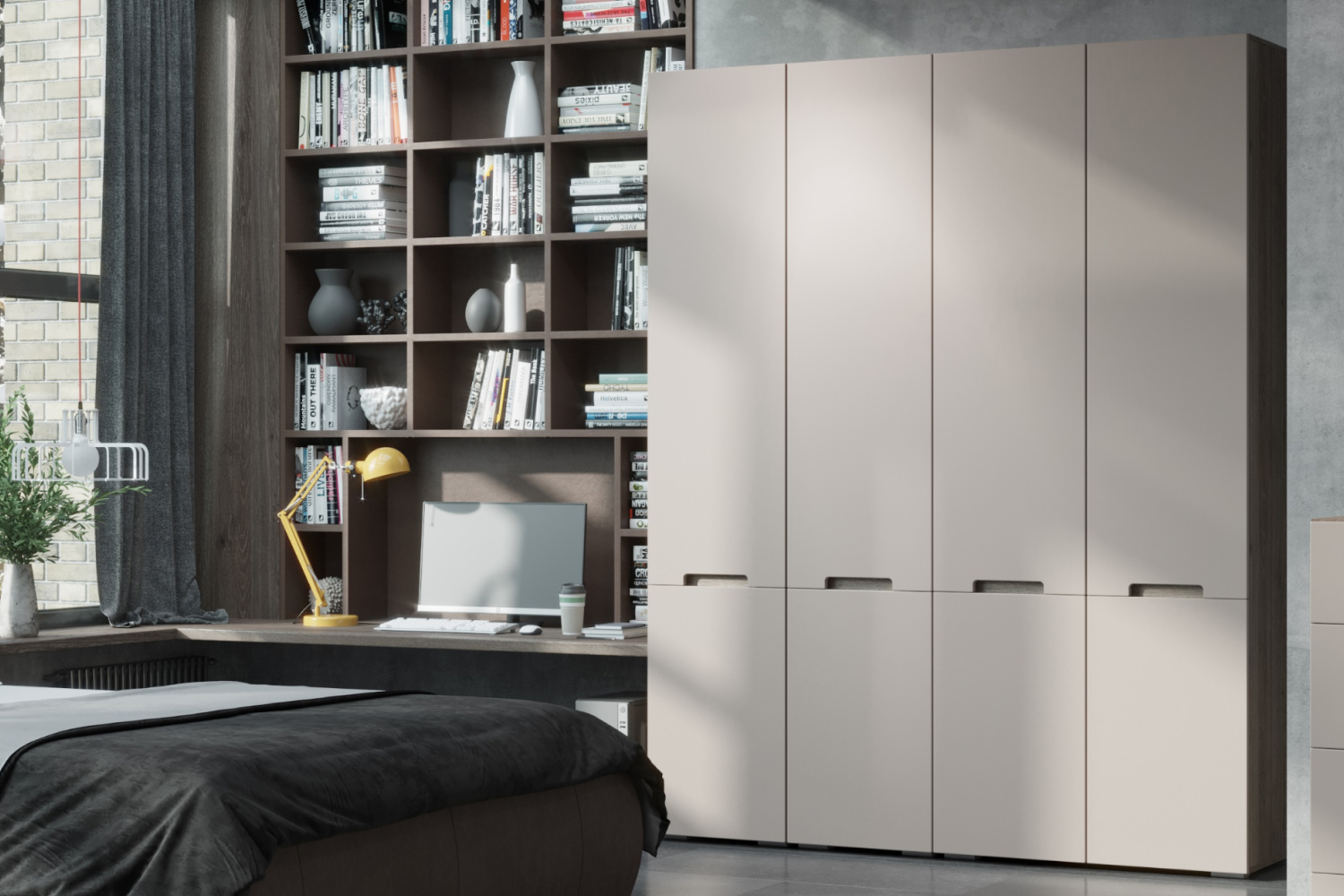 Корпус предметов интерьера изготовлен в теплом цвете «давос трюфель», который прекрасно сочетается с более светлым, бежевым покрытием фасадов. Матовые поверхности с эффектом бархата подарят приятные тактильные ощущения во время эксплуатации мебели. Замена традиционной фурнитуры на скрытые профильные ручки облегчает внешний вид комплекта, визуально делает его более воздушным и компактным.