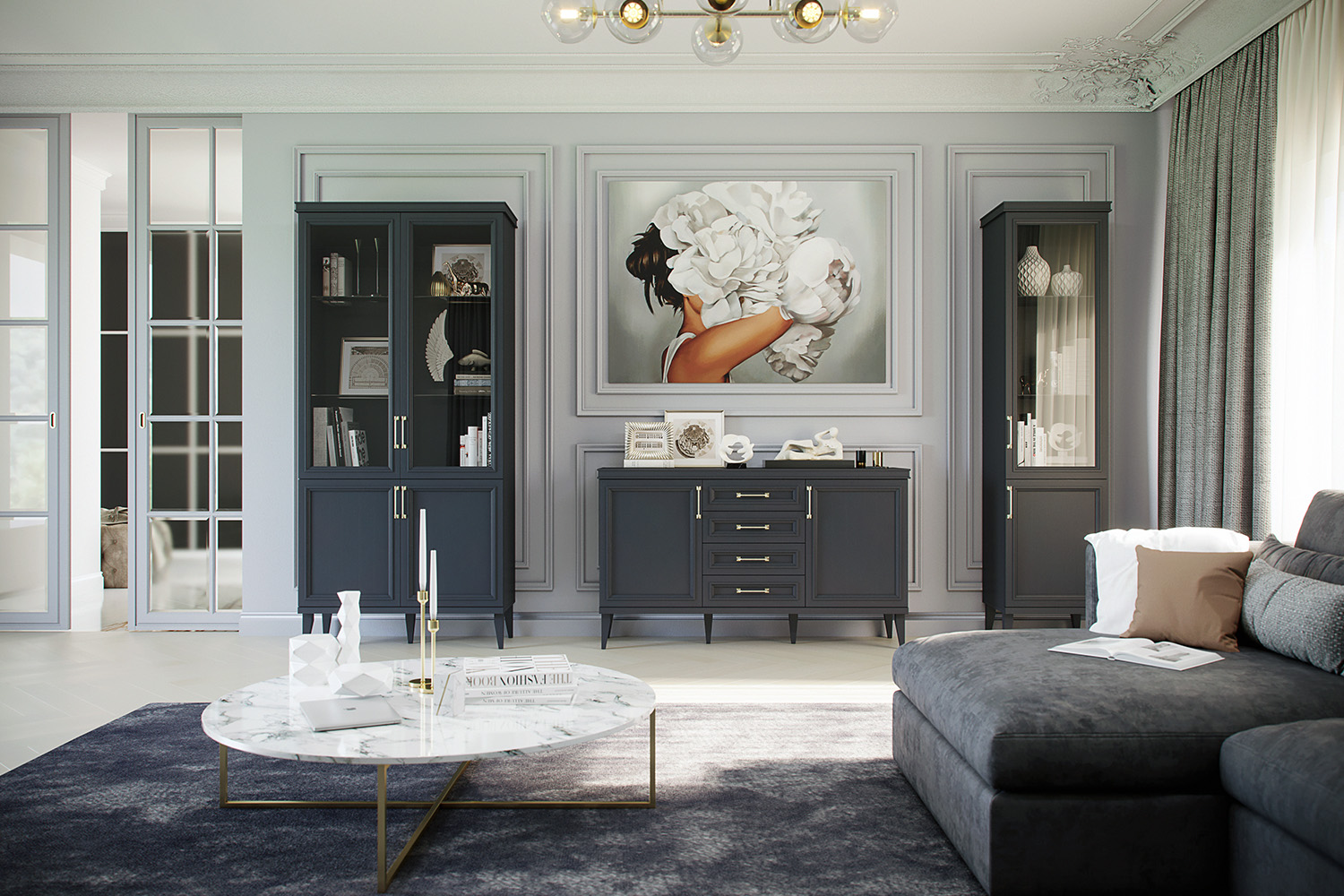 Комод состоит из трех отделений — центрального с четырьмя выдвижными ящиками и двух боковых с распашными дверцами. За левым и правым фасадами прячутся прочные полки из ламинированной ДСП. Ящики оснащены скрытыми направляющими, которые обеспечивают максимальный доступ ко внутреннему пространству и гарантируют бесшумную эксплуатацию изделия. Для данного товара доступны доставка и сборка.