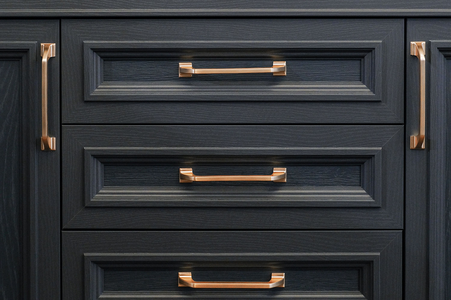 Сочетание фасадов, выполненных в цвете «серый уголь», со сверкающими металлическими ручками-скобами выглядит эффектно и дорого. Рамочные конструкции декорированы сложными филенками, столешница из ЛДСП имеет необычную геометрию с выступающими краями. Устойчивость модели придает шесть высоких, скошенных ножек-опор из букового массива, окрашенных в основной тон. Такая мебель идеально дополнит интерьер в стиле лофт или минимализм, внесет в обстановку нотки солидности и респектабельности.