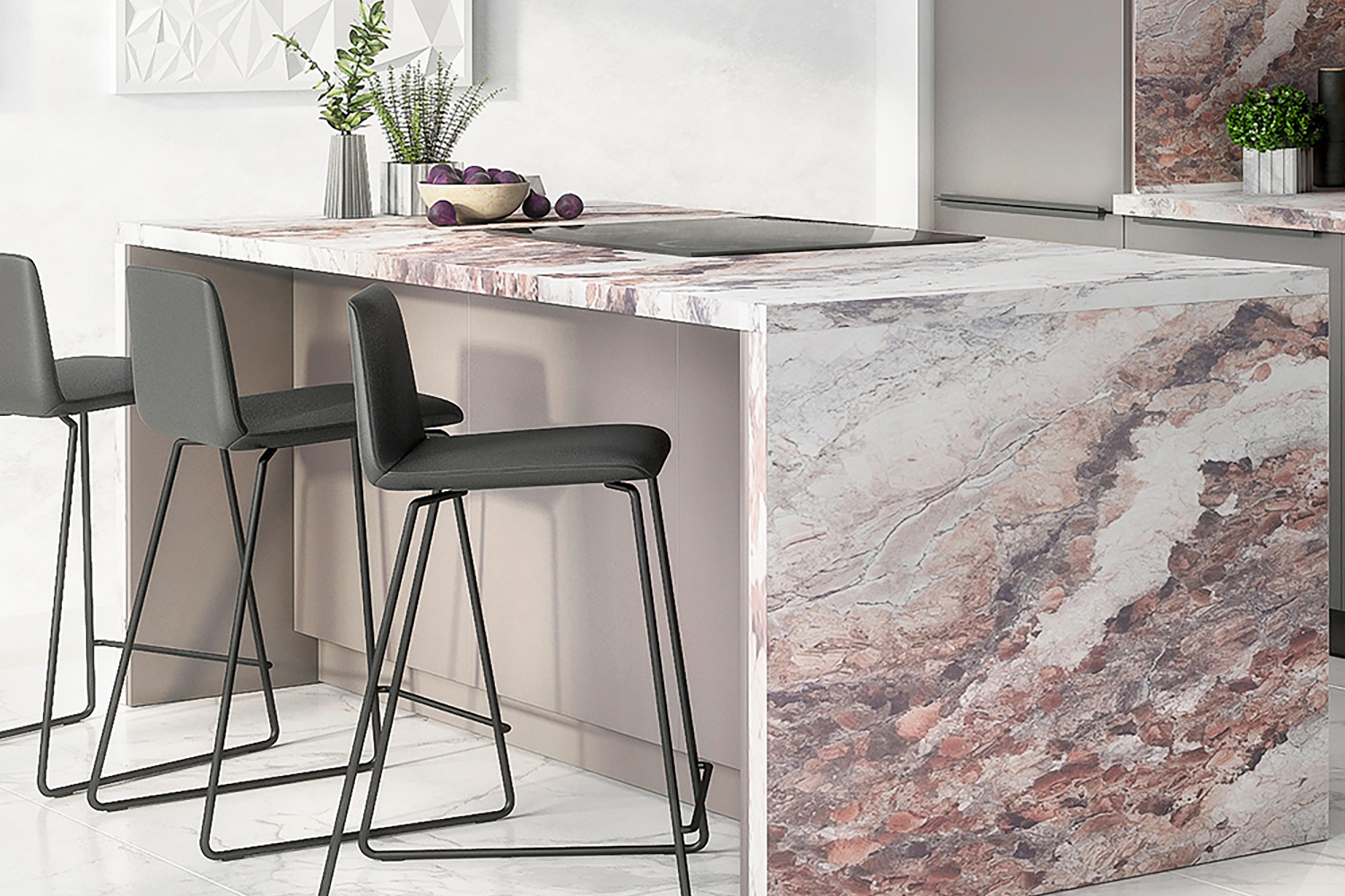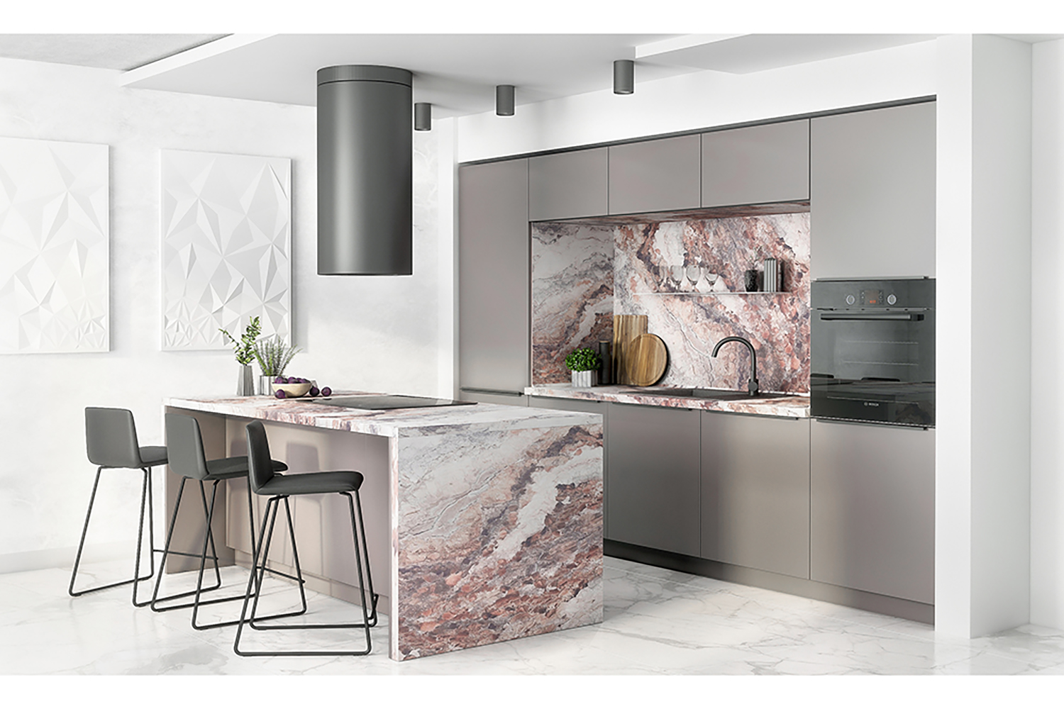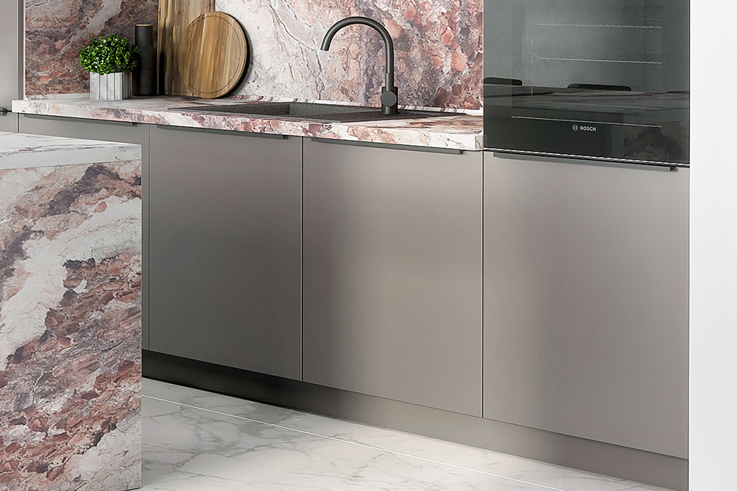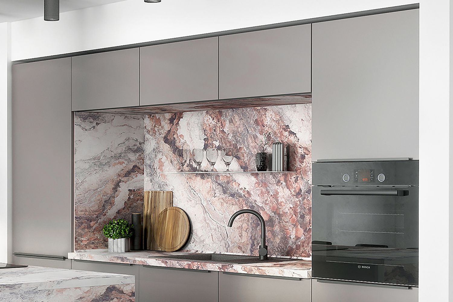 Этот кухонный гарнитур предназначен для ценителей индивидуальности. Фасады мягкого оттенка «кофе с молоком» гармонируют с роскошной столешницей, стилизованной под текстуру мрамора с розовыми и красными прожилками. Все внимание на цвета, никаких лишних деталей: гладкие и ровные поверхности оснащены скрытой фурнитурой. Благодаря механизмам push on дверцы навесных шкафов открываются одним легким нажатием, а отсеки нижнего яруса выдвигаются при помощи профильных ручек.