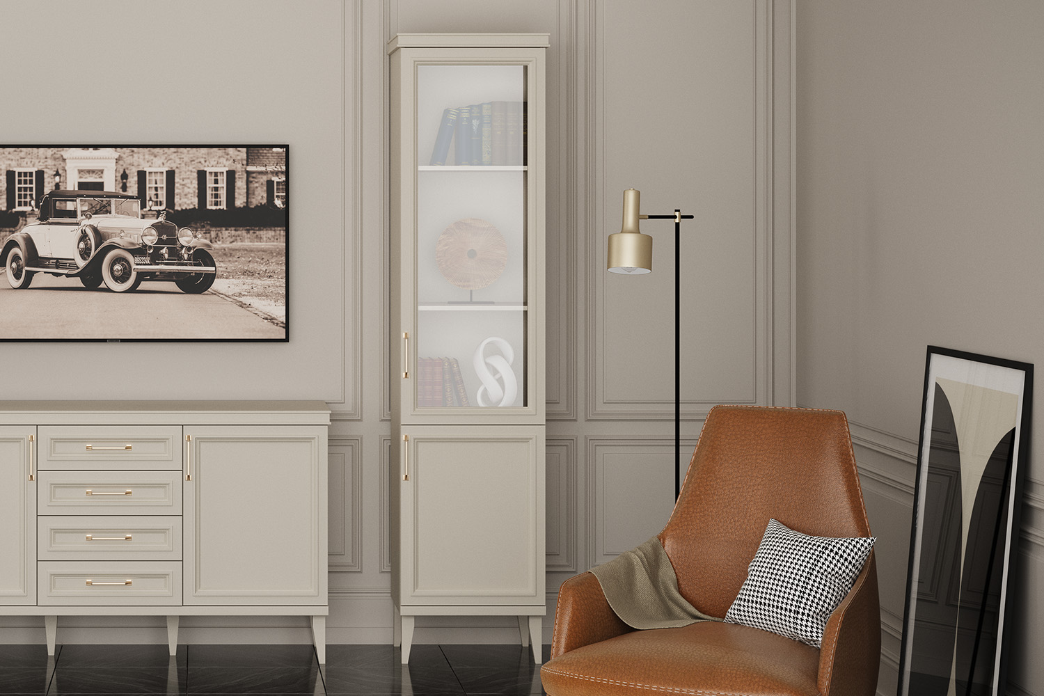 - Шкаф 1-створчатый с 1 стеклянным фасадом и 1 глухим фасадом;