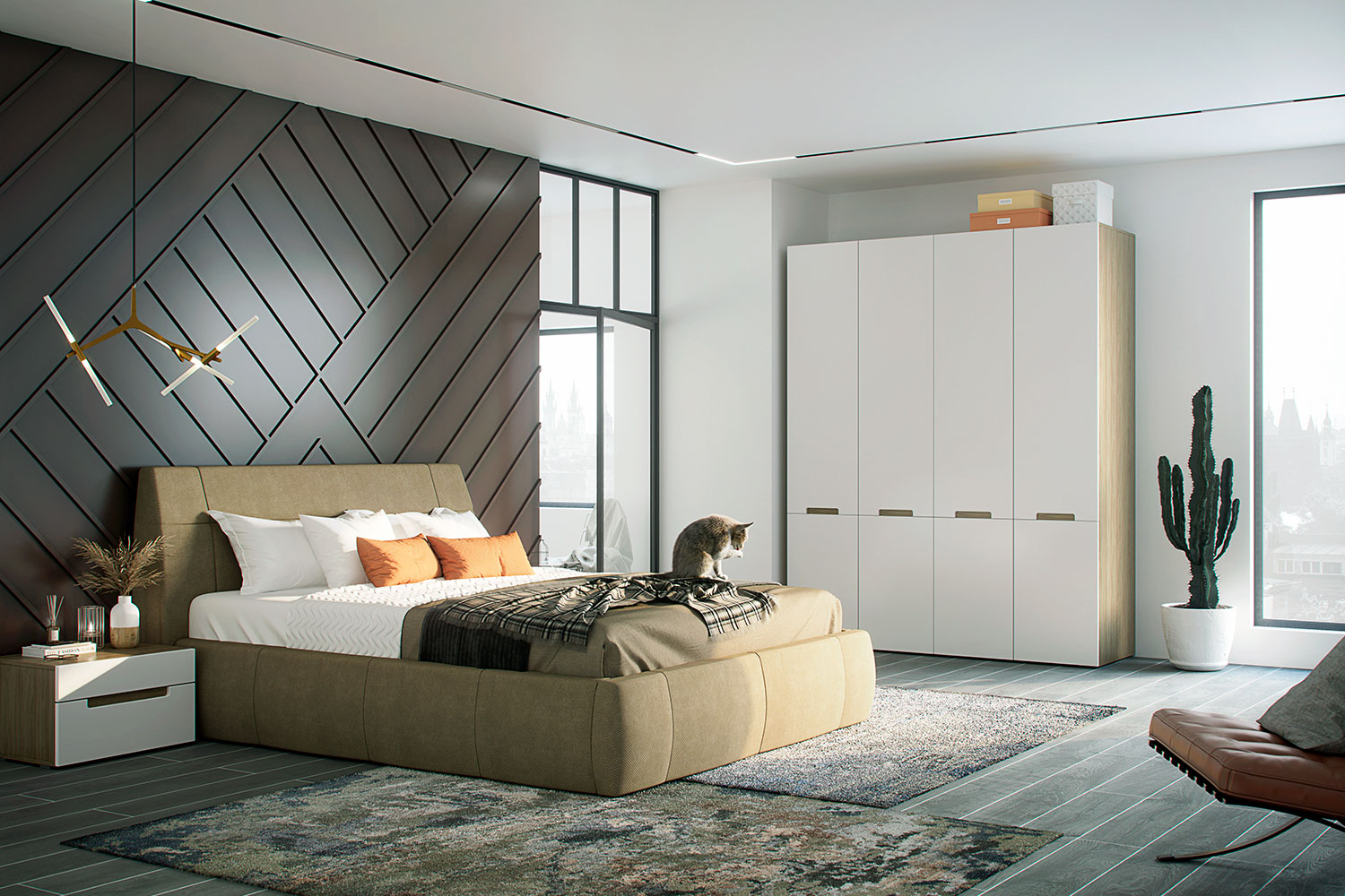 - Спальня в современном стиле. Такая мебель универсальна и подойдет интерьерам в стилях эко, скандинавский, минимализм или лофт;