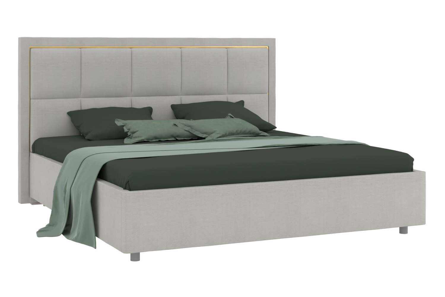 Обивка стильного оттенка «серый кашемир» выполнена из практичного и износостойкого микровелюра. Высокое изголовье простегано декоративной строчкой, украшено по периметру золотой окантовкой. Каркас изделия изготовлен из ламинированной ДСП. Мягкая отделка сводит риск травматизации в ночной атмосфере спальни к минимуму. Упругие ламели ложа обладают ортопедическим эффектом. Металлические ножки-опоры окрашены порошковой краской в серый цвет.