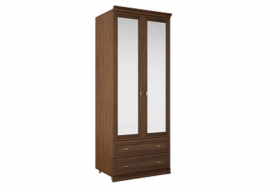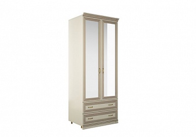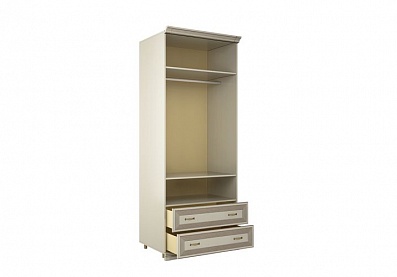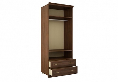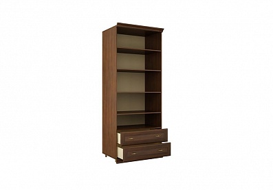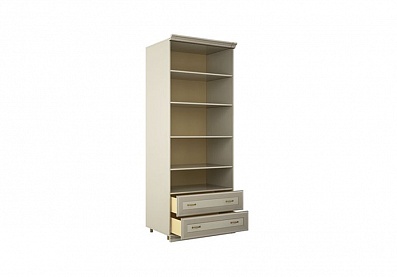 - Шкаф с двумя секциями по ширине (одна секция — с тремя полками, вторая — с двумя выдвижными ящиками и отделением с полкой за распашной дверью);