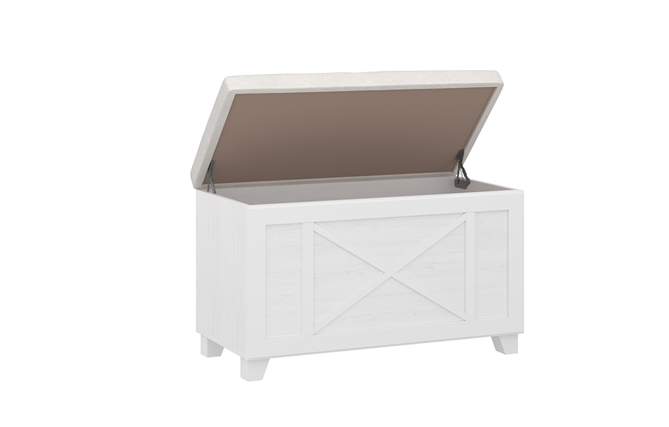 Меблировка выполнена из ламинированной ДСП и МДФ-профиля. Откидная крышка имеет мягкую отделку сверху, а ее петли оснащены демпфером для плавного и бесшумного закрывания. Все кромки облицованы качественным материалом.
