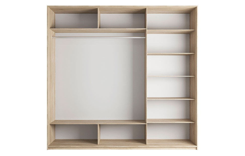- Внутреннее пространство разделено на 3 части — две части объединены в одну, содержат штангу и по 2 ниши сверху и снизу. Третья часть укомплектована пятью полками;
