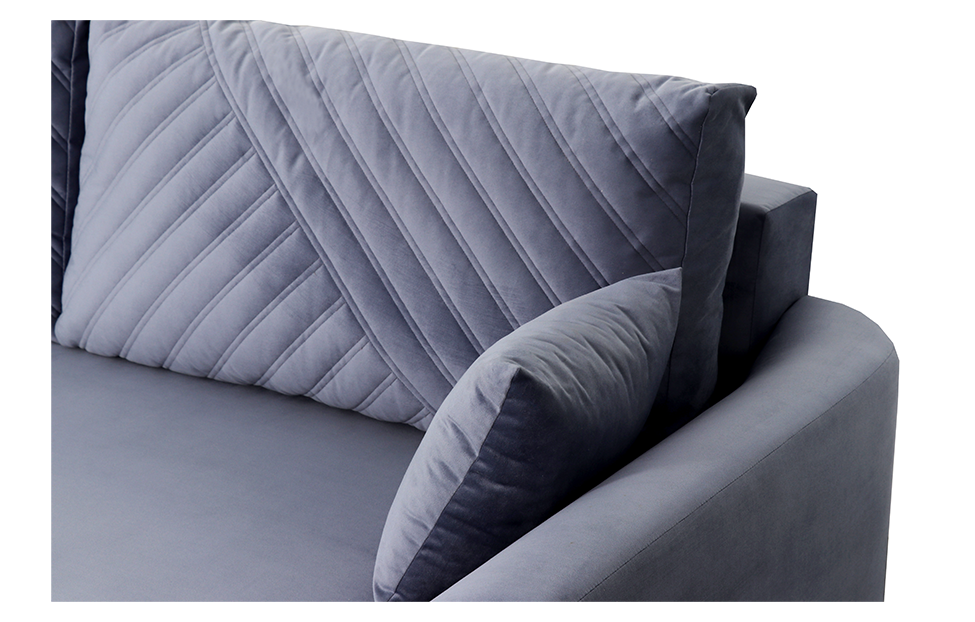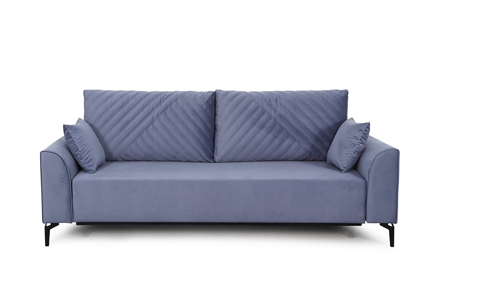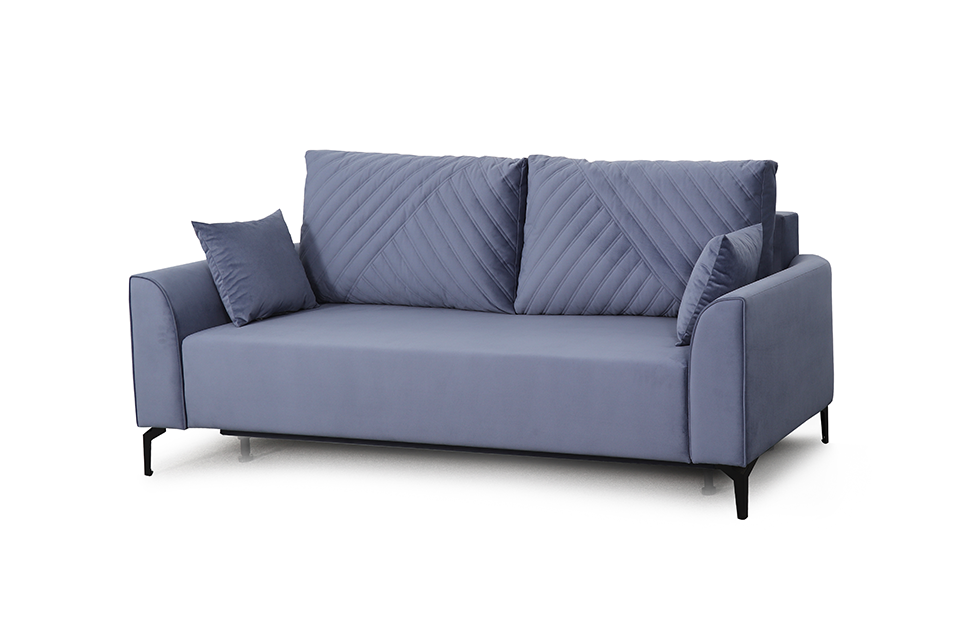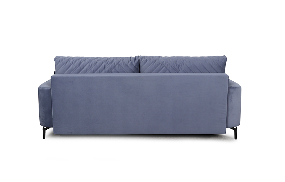 Эффектный диван серо-синего оттенка «мора деним» станет настоящим украшением гостиной или спальни. Благодаря отделанной тканью задней стенке изделие также можно задействовать для зонирования помещения. Легкость геометрии мебели подчеркнута тонкими металлическими опорами, окрашенными в черный цвет. Подушки спинки украшены противоположно направленными диагональными декоративными швами. Закругленные с внутренней стороны подлокотники по периметру оформлены изящной отстрочкой.