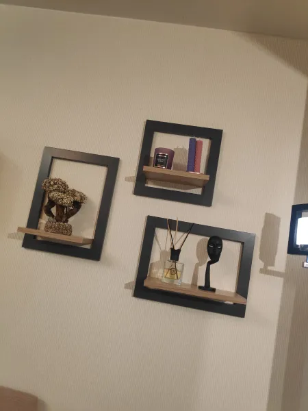 Открытая квадратная полочка выглядит нестандартно за счет формы и контрастной оправы. Рама изделия изготовлена из профиля МДФ, окрашенного полимерной краской матового графитового цвета. Выступающая часть изделия выполнена из ламинированной ДСП, текстурированной под светлую древесину «дуб бунратти».