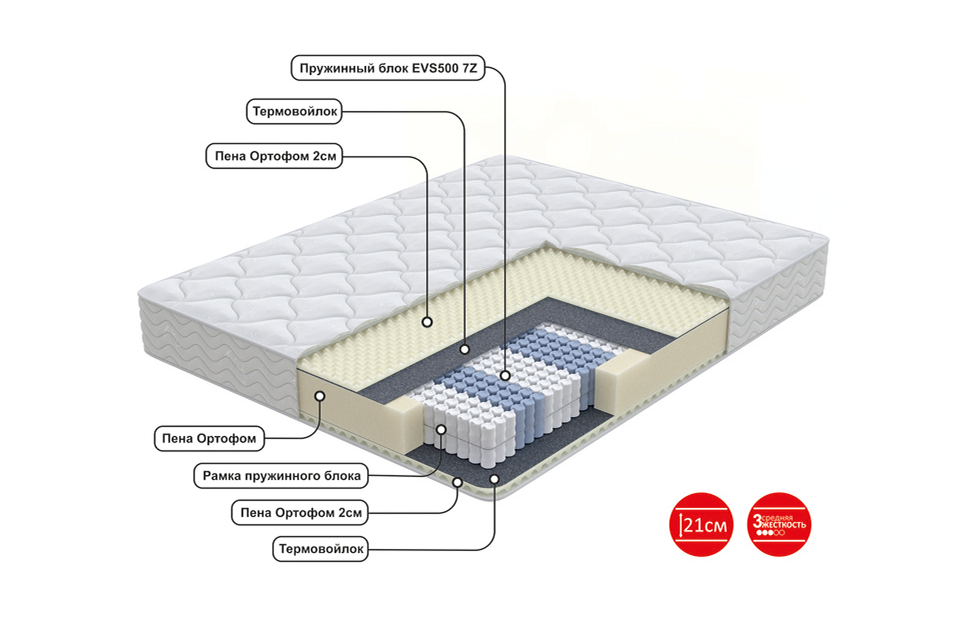 Rendi матрас универсальной средней жесткости. В основе матраса пружинный блок EVS 500, который имеет 7 зон комфорта для оптимальной поддержки всех участков тела спящего. За счет особой структуры поверхности пены в комфортном слое матраса, создается микромассажный эффект, способствующий расслаблению мышц. Дополнительную мягкость матрасу придает трикотажный чехол, простеганный на объемном волокне и эластичном материале Ортофом.