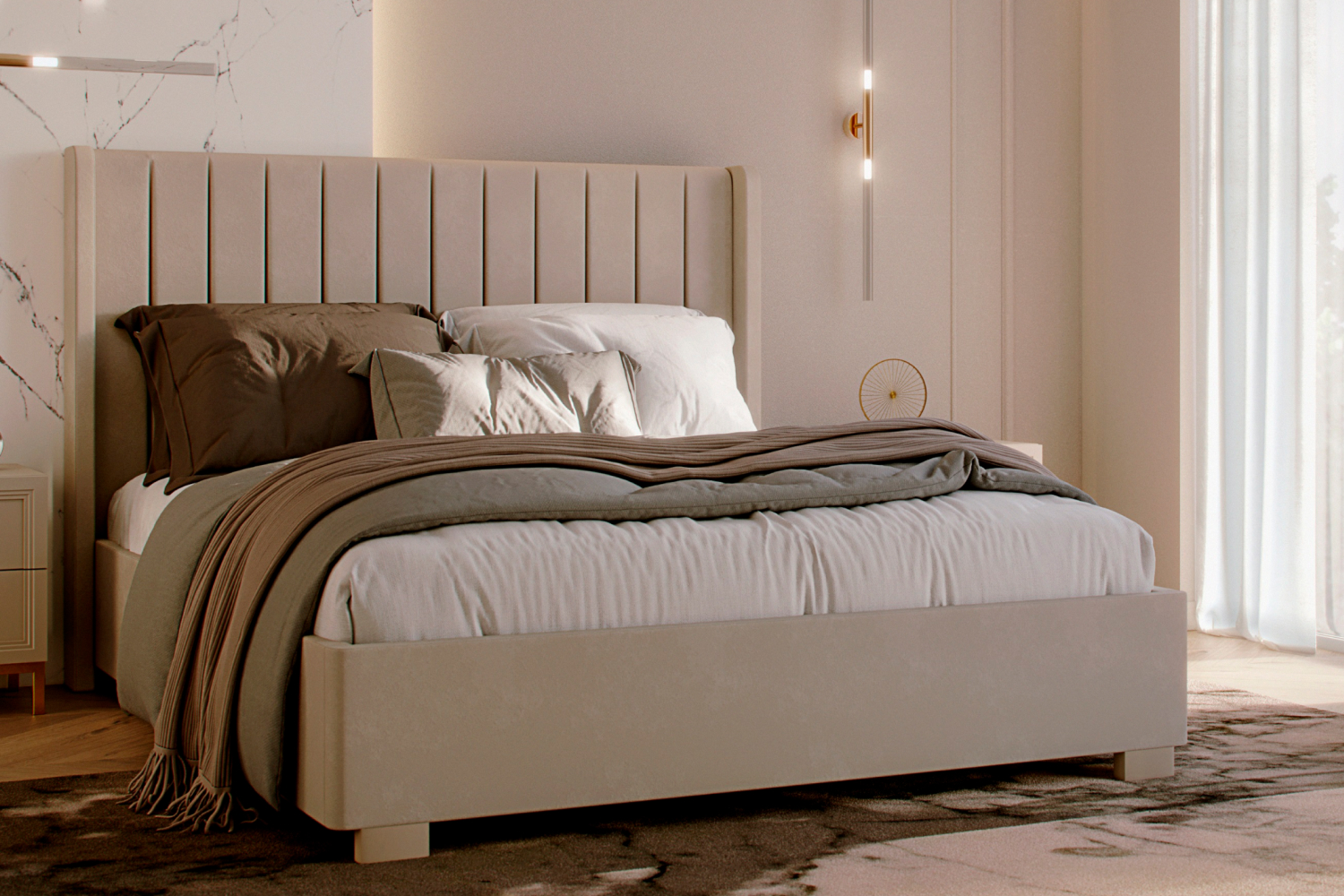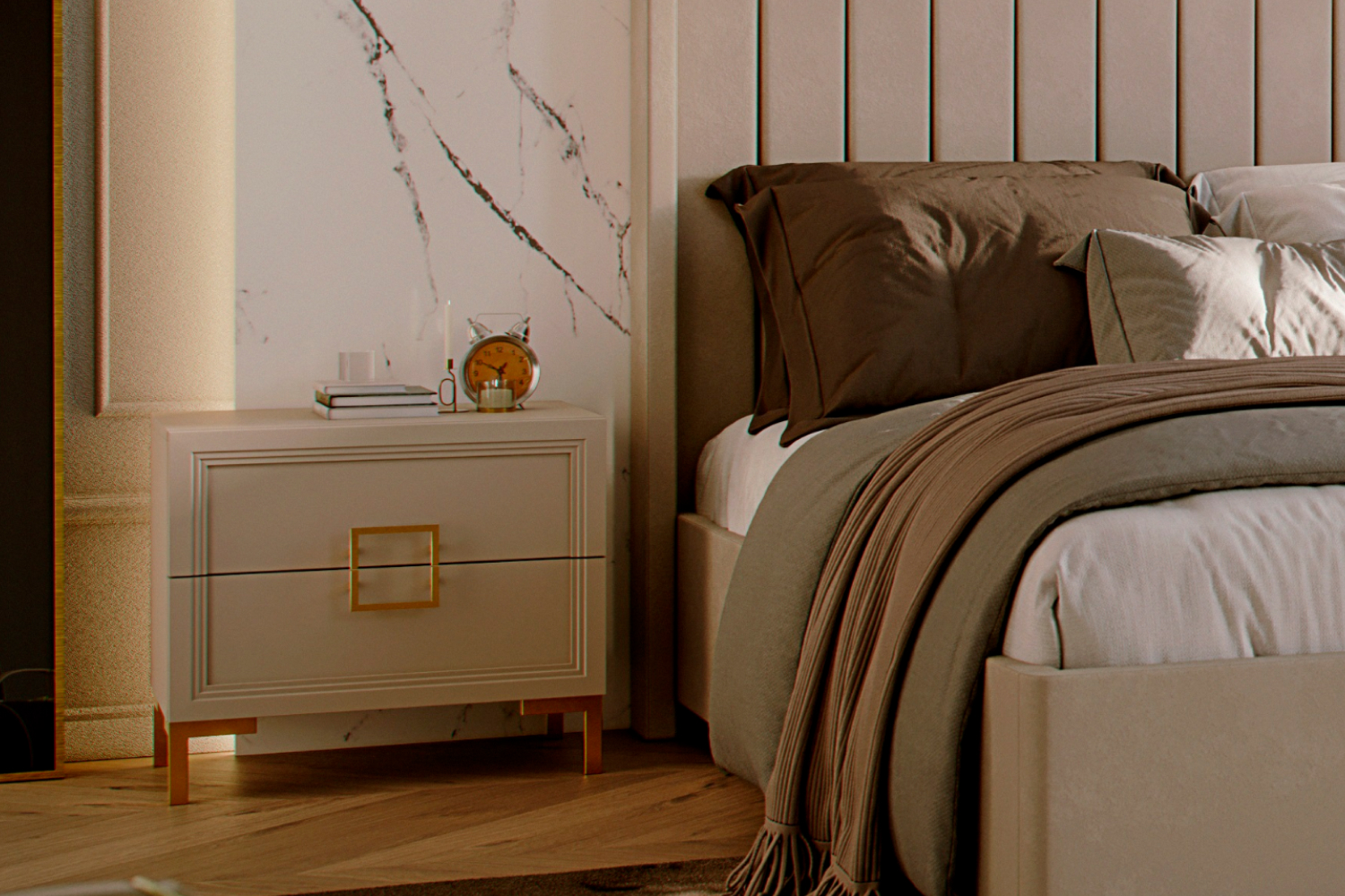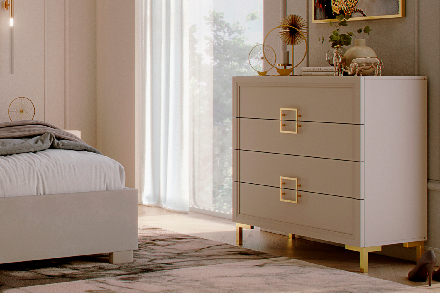 - Спальня Дольче выполнена в стиле эклектики, а также соединяет в себе стиль ар-деко в современном прочтении и минимализм. К строгим формам и безупречной геометрии добавлена гладкая текстура кашемира, позволяющая смягчить декор и подарить коллекции шлейф тонкой роскоши с золотыми вставками;