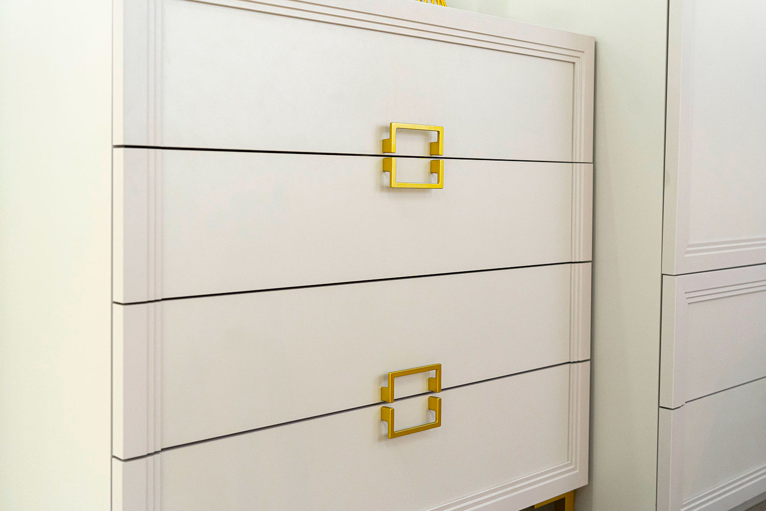 - Основу дизайна составляет геометрический символ — квадрат. Это видно по золотым матовым ручкам на тумбах;