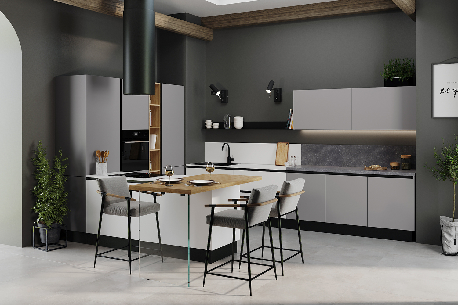 Эта модель современная, свежая и модная. Ультраматовые фасады глубоких оттенков отделаны инновационным самовосстанавливающимся покрытием. Благодаря этому покрытию можно забыть про отпечатки пальцев на фасадах.