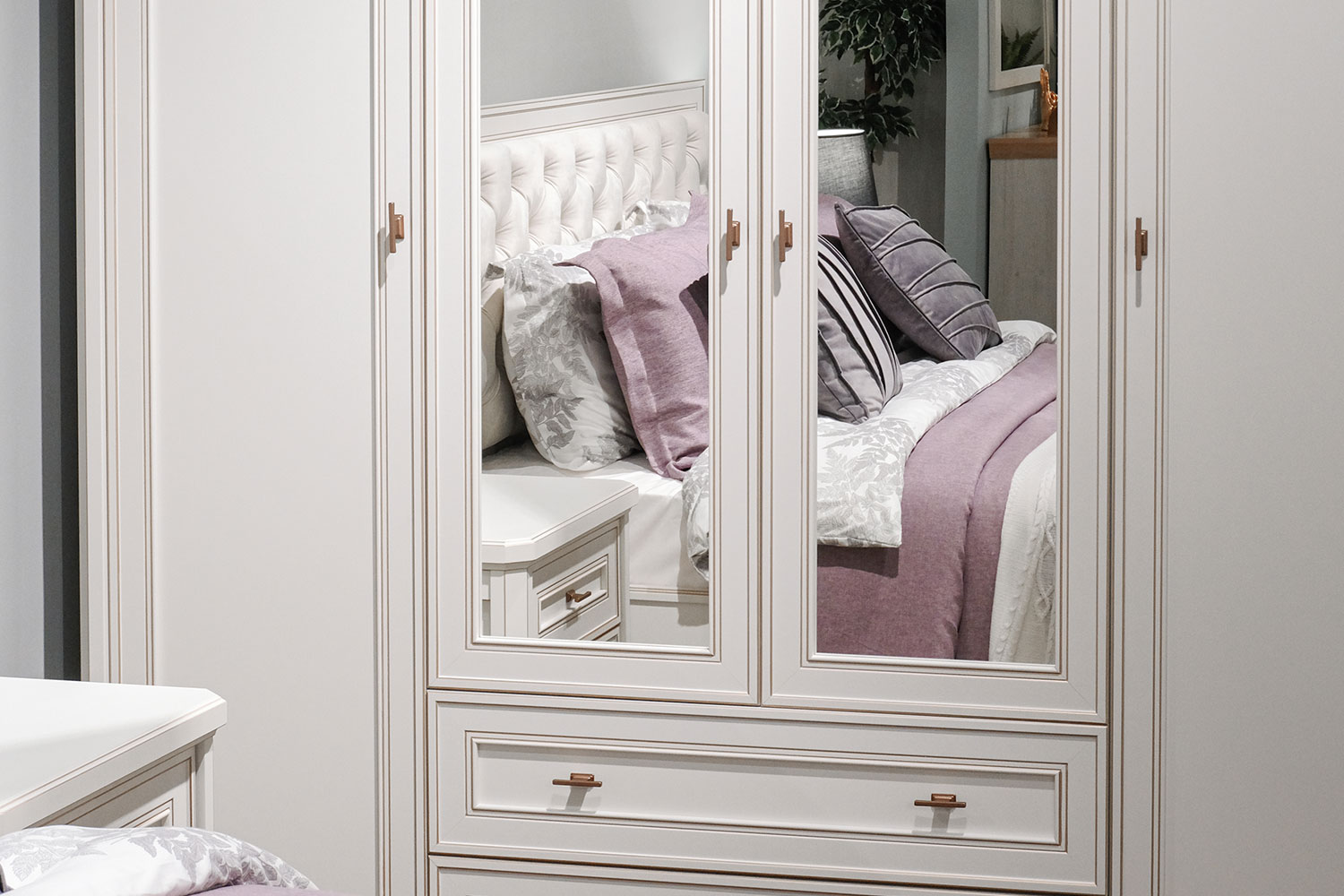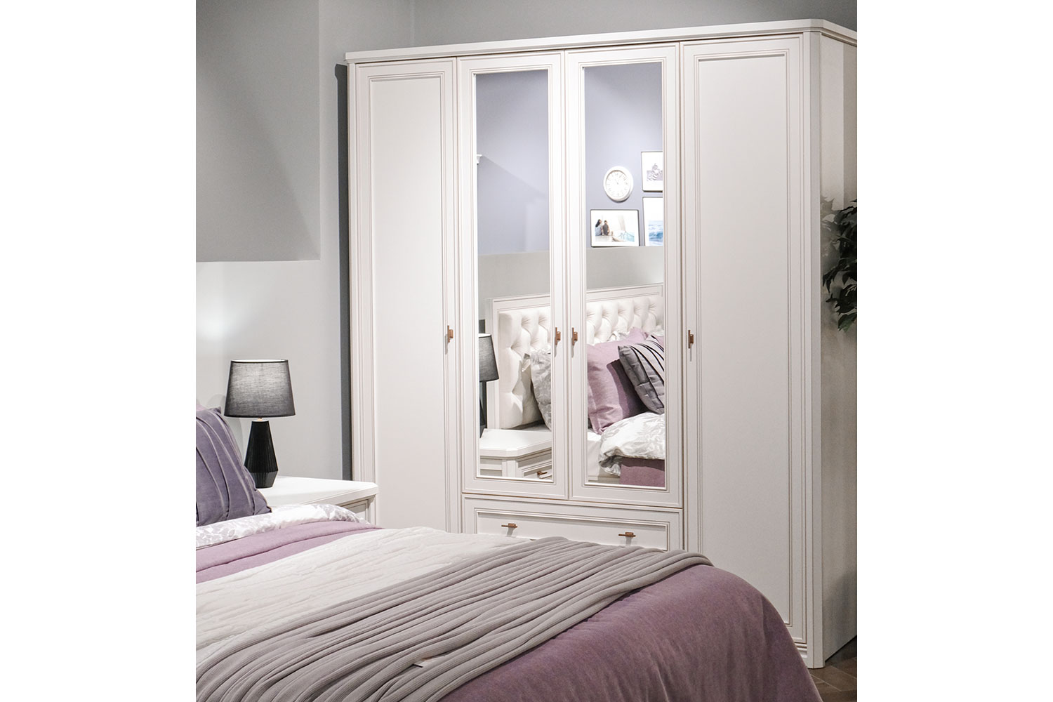 - Широкое отделение за 2 зеркальными фасадами. В нижней части отделения два выдвижных ящика, в верхней полка и штанга для одежды;
