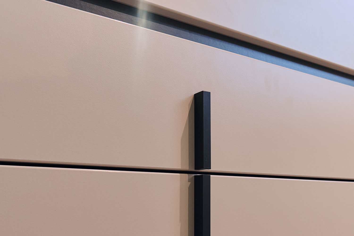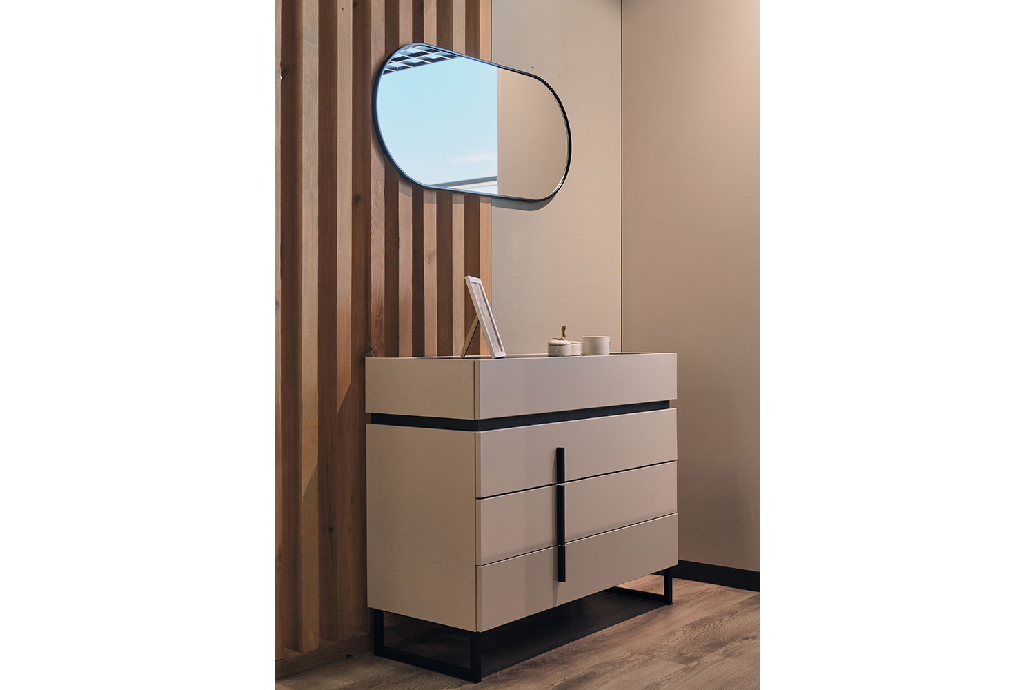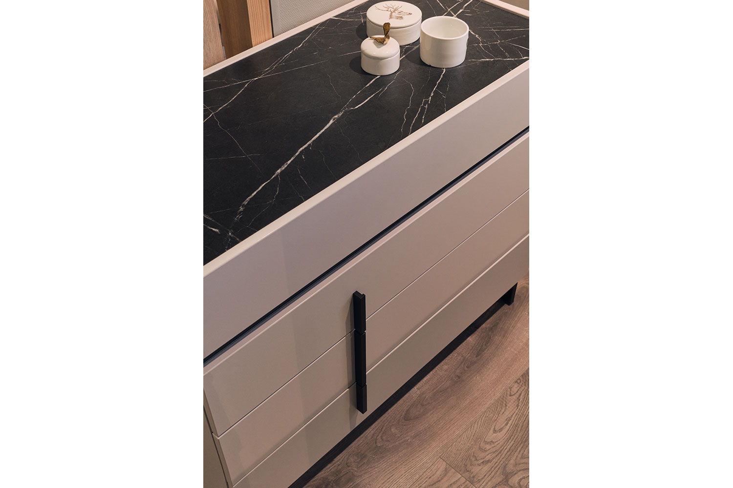 Все модули гармонично сочетаются друг с другом. Черный акцентный мрамор добавляет коллекции изысканности и роскоши, а выразительная геометрия тонких черных ручек на фасадах, перетекающая в линию опор, придают ей современный вид.