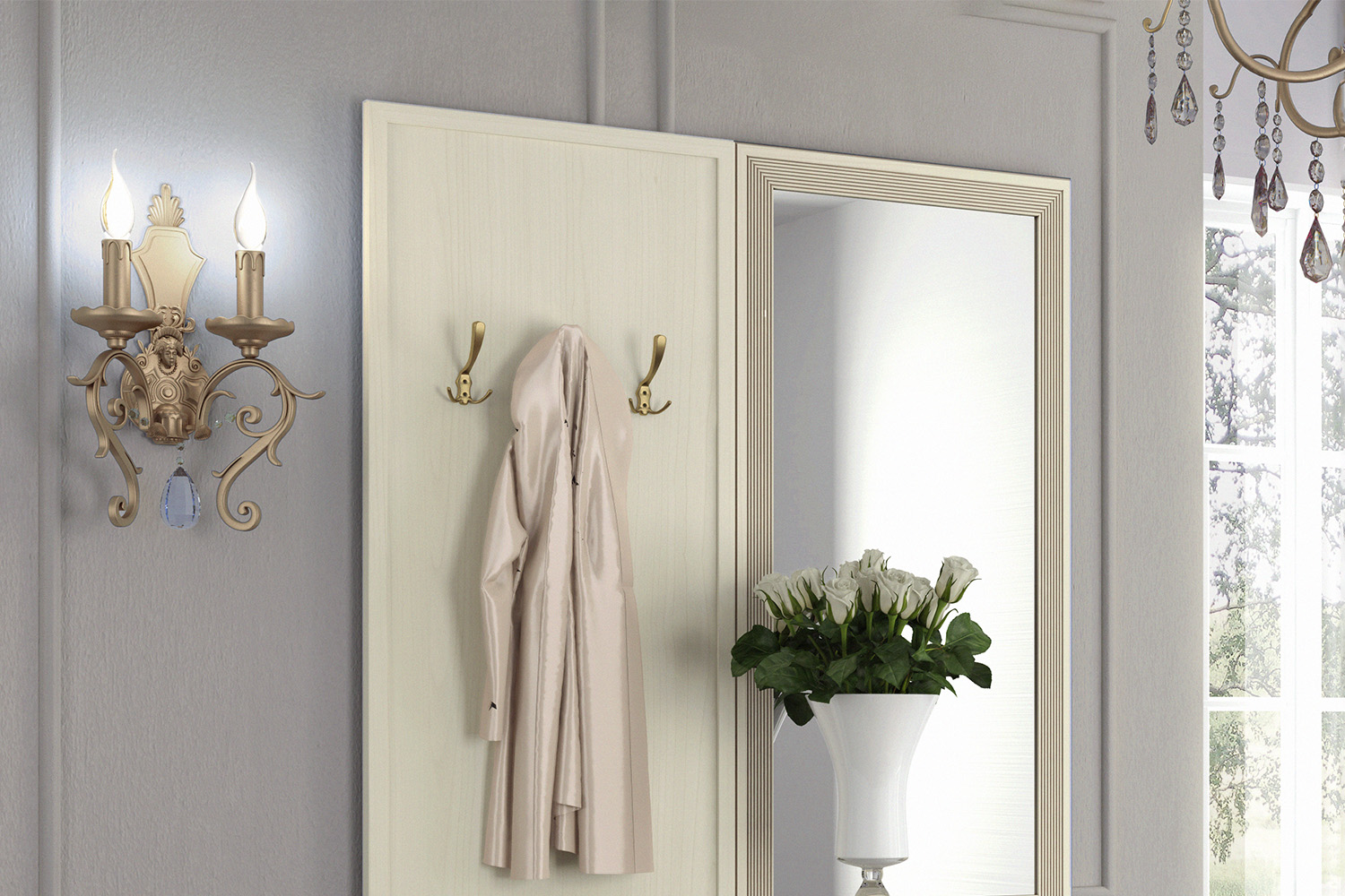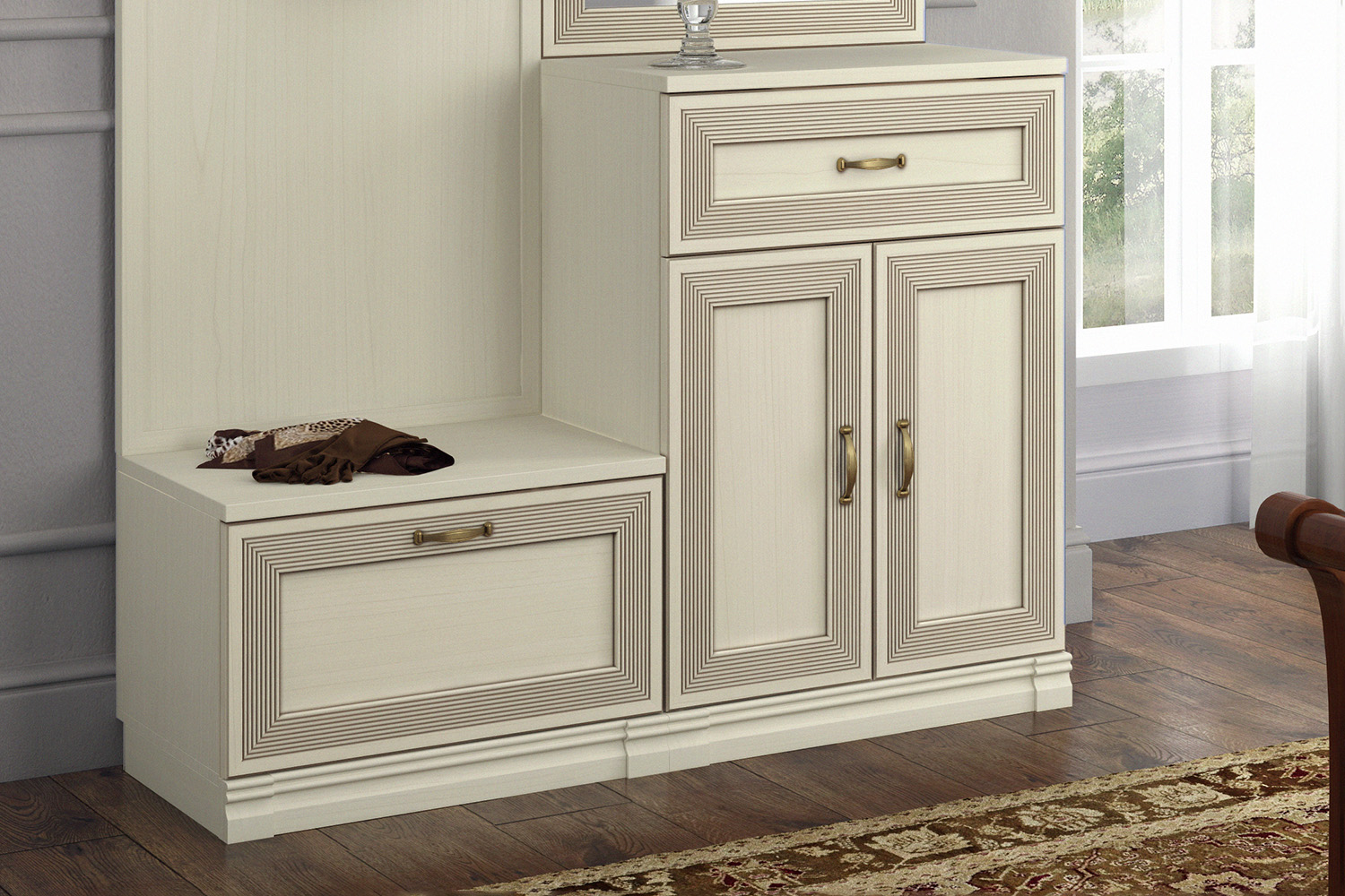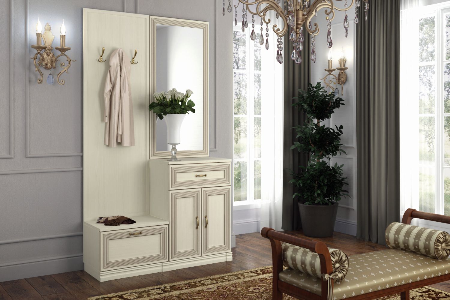- Адажио — образец сдержанности и изящества, стиля и элегантности. Мебель из коллекции подойдет не только к классическим интерьерам, но и к прихожим в стилях фьюжн, контемпорари и эклектика;