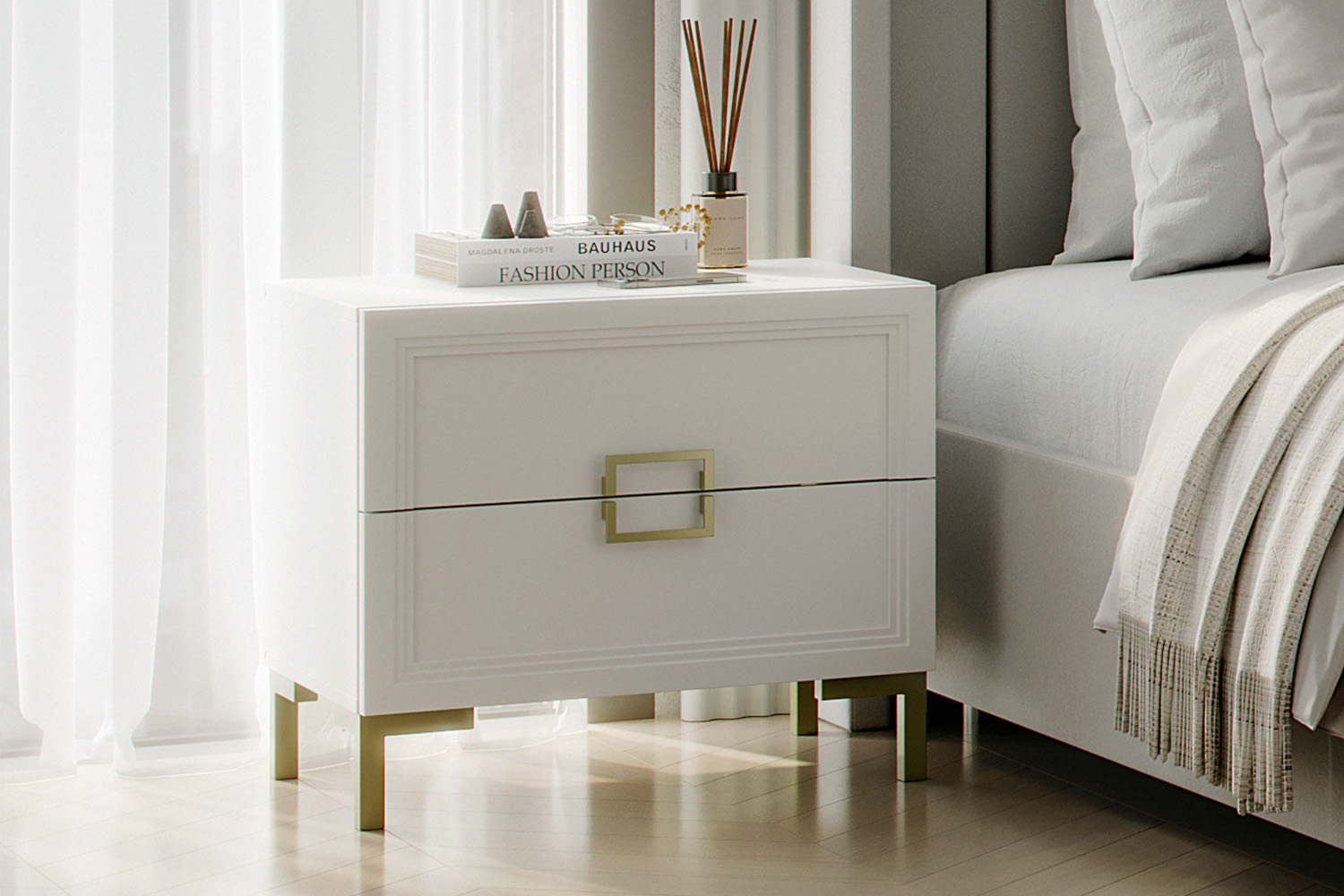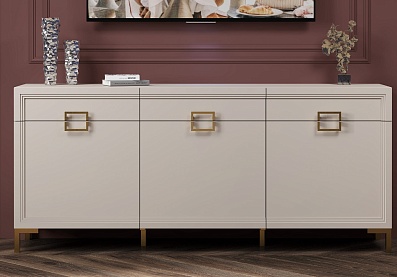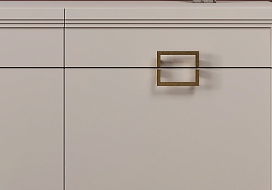 - Основу дизайна составляет геометрический символ — квадрат. Это видно по золотым матовым ручкам на тумбе и столе;