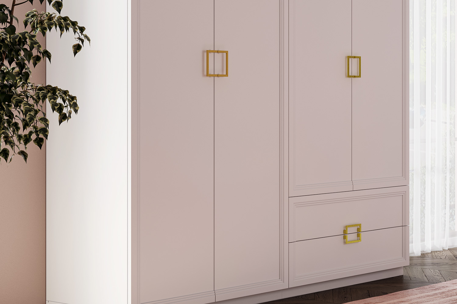- Основу дизайна составляет геометрический символ — квадрат. Это видно по золотым матовым ручкам на тумбах и шкафах.