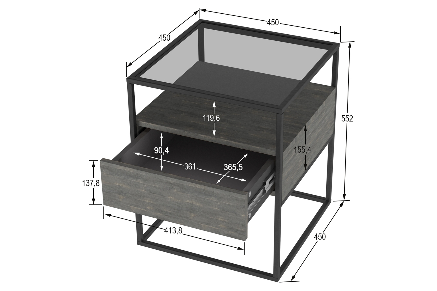 Прикроватная тумба Эйд выполнена в современном лаконичном стиле и уместно дополнит интерьер гостиной. Стильная тумба приковывает внимание, прежде всего, своим исполнением: комбинацией используемых материалов. Стеклянная столешница из тонированного закаленного стекла в сером цвете дополнена полкой и ящиком для удобного хранения подручных вещей с системой открывания PUSH-TO-OPEN. А прочный металлический каркас из профиля толщиной 15 мм обеспечивает высокую прочность и устойчивость.