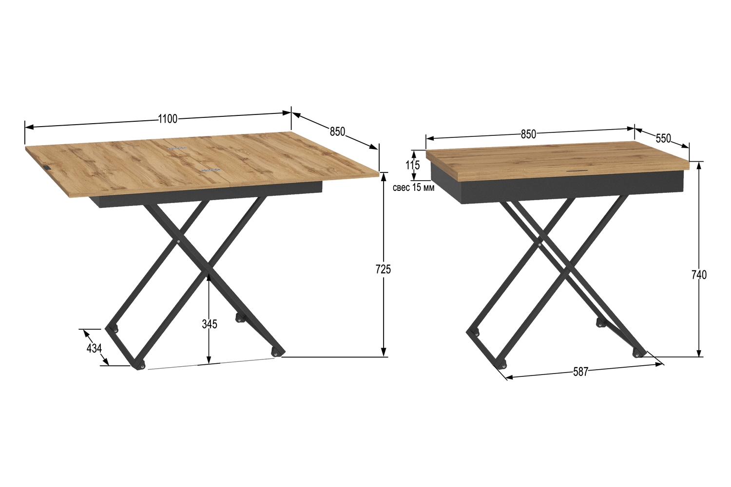 Размеры столешницы в сложенном состоянии 85 x 55 cм, в разложенном — 110 х 85 cм. По высоте стол имеет два положения (разложенный/сложенный): 38,5/40 см и 72,5/74 см. Ножки стола выполнены из прочного металлического профиля, столешница — из ЛДСП. Стол на прорезиненных роликовых опорах, что без труда позволит перемещать его в помещении, при этом не царапая и не повреждая напольное покрытие.
