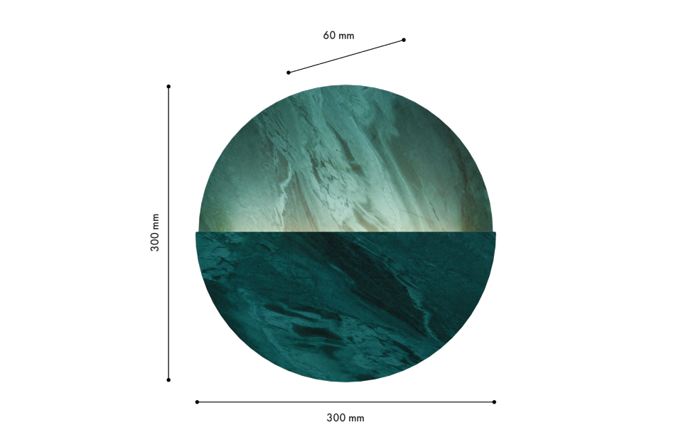 Представляем вам коллекцию Eclipsis, словно созданную самой природой. Настенный светильник представляет собой две половинки диска из керамогранита в цвете зелёный мрамор, между которыми струится мягкий свет, создавая завораживающее зрелище, напоминающее затмение небесных тел. Узор камня оживает благодаря игре света (LED-модуль с рассеивателем из акрила белого цвета) и усиливает оптический эффект.