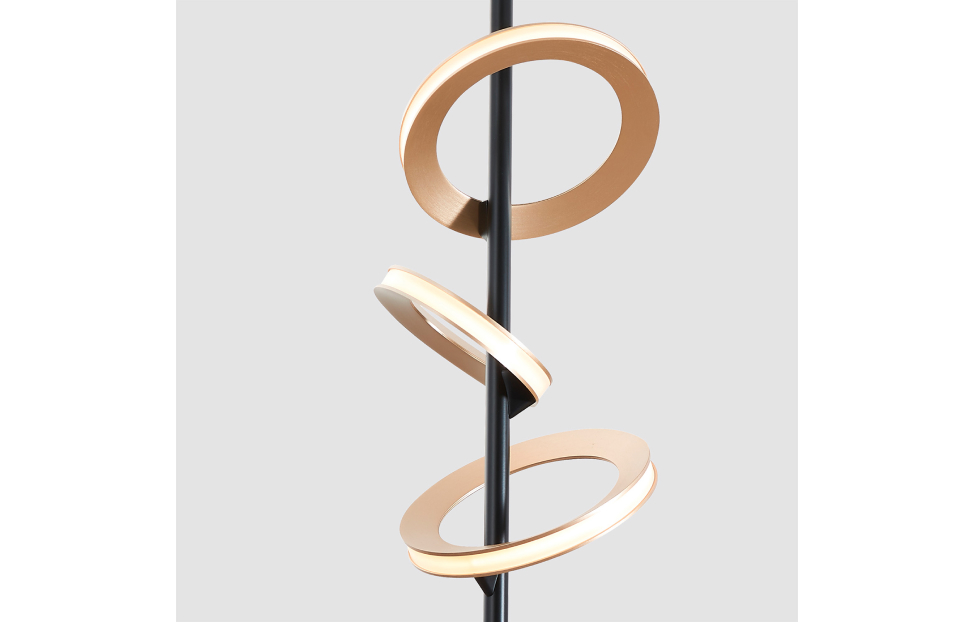 Коллекция Jongleur демонстрирует искусство баланса и динамики, где каждый элемент словно находится в постоянном движении. В качестве плафонов использованы объемные кольца цвета матовой латуни, которые светятся по периметру с помощью встроенной LED-ленты. Они закреплены под разным углом к тонкому черному каркасу светильника, будто вращаются вокруг основания, словно цирковые обручи хула-хуп. Регулируемая высота.