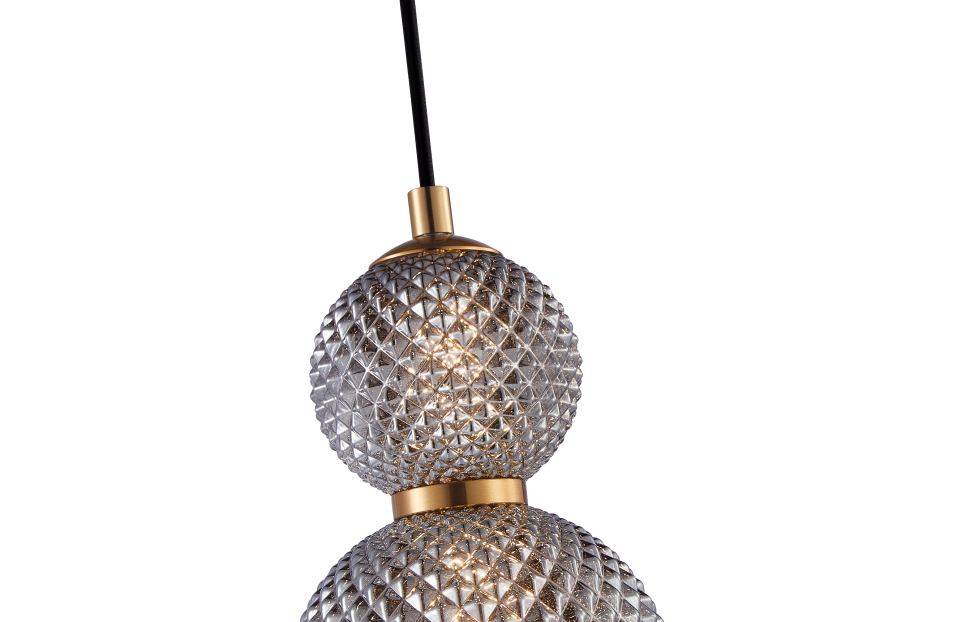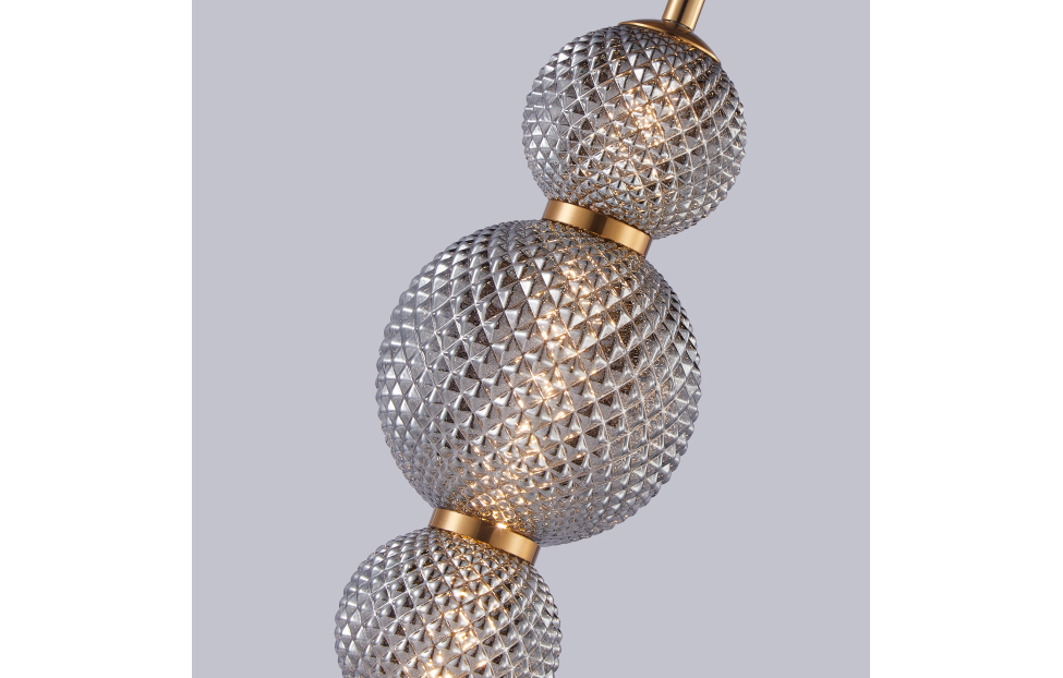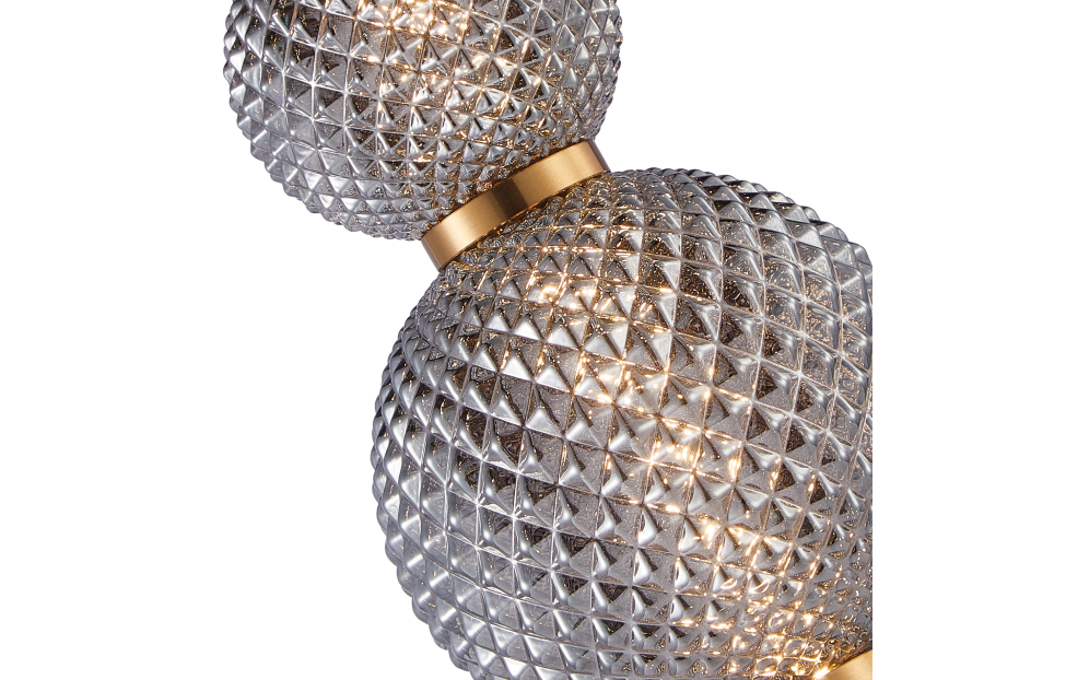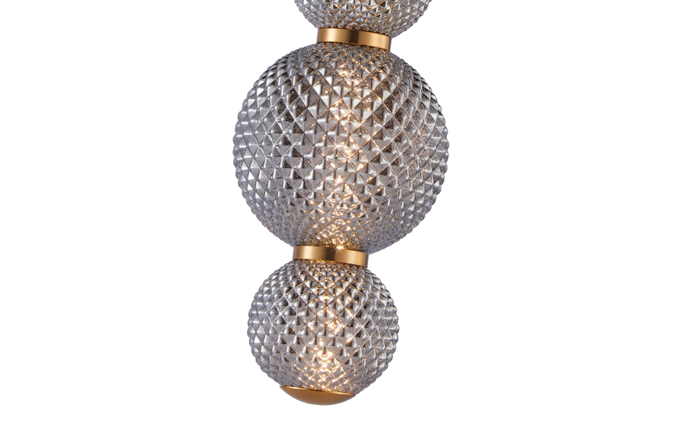 Коллекция Kiran – это гармония стекла и света. Стеклянные фактурные плафоны раскрывают свой характер в мягком струящемся свете и узорных отражениях на потолке, стенах, предметах мебели. В качестве источника света используется трубка с LED-модулем, проходящая внутри плафонов из фактурного стекла дымчато-серого цвета. Декоративный ободок золотого цвета добавляет сдержанного блеска в дизайн коллекции и придает ей особую привлекательность. Регулируемая высота.