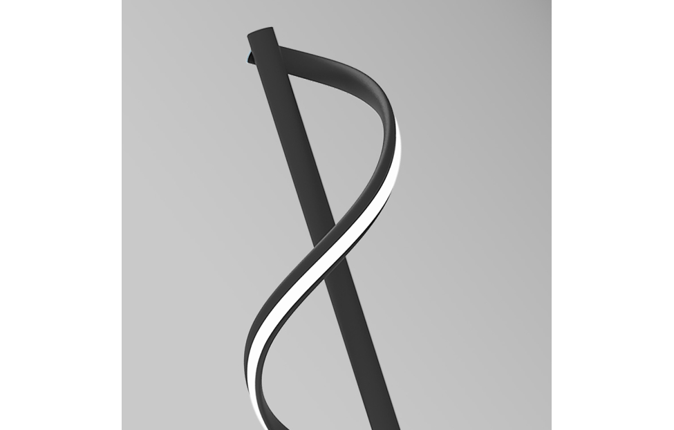 Настольный светильник Locket представлен в чёрном цвете. Вытянутый жесткий профиль декорирован гибким профилем, который оснащен LED-лентой и мягкой волной оборачивается вокруг жесткого профиля. Выключатель на проводе.
