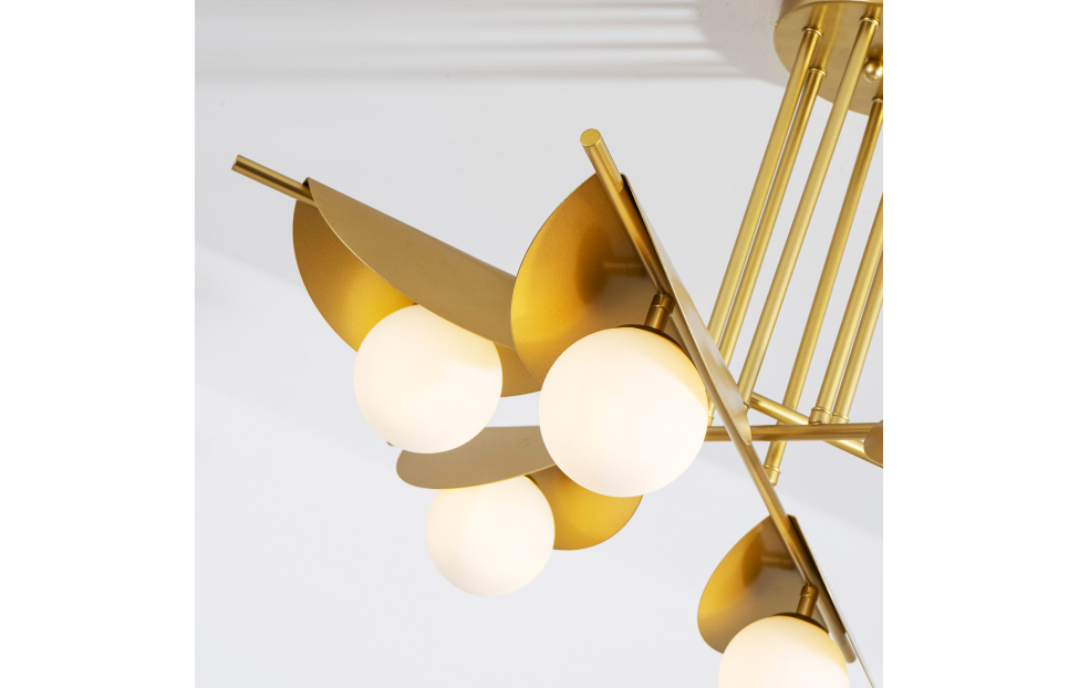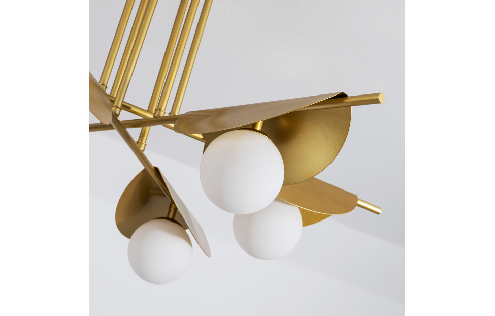 Kernel по задумке дизайнера – это стилизация природного явления: светильники напоминают жемчужину в раковине. Золотой цвет металлического каркаса подчеркивает яркость белых выдувных плафонов.
