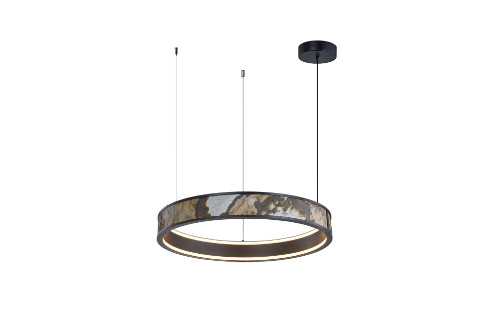 Коллекция Lago расширяет границы визуального восприятия декоративного материла LAGO натуральный песчаник, умелое использование которого сделает любой интерьер авторским. По внутреннему периметру подвесного светильника расположены два светодиодных источника света с белым рассеивателем из акрила. Они обеспечивают равномерное распределение света и создают комфортное для глаз освещение. Каркас из металла черного матового цвета, ленты LED по периметру плафона из натурального камня.