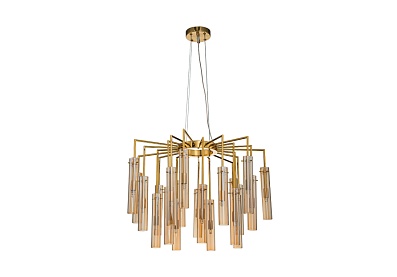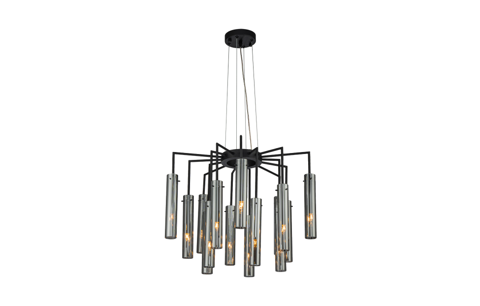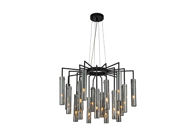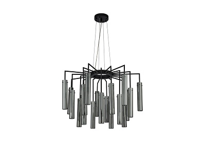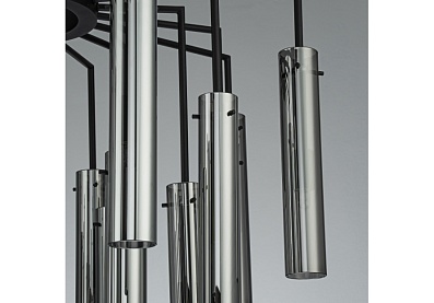 Каскадная люстра Orgel, каркас черного цвета, состоит из металлических трубок, изогнутых от центрального кольца под прямым углом, на конце каждой трубки расположен тонкий длинный плафон из стекла дымчато-серого цвета, сменная лампа G9, регулируемая высота.