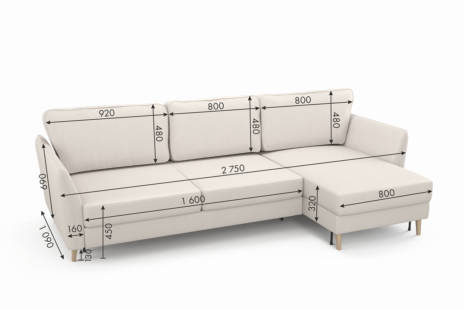 - Высота дивана с ножками: 75 см;