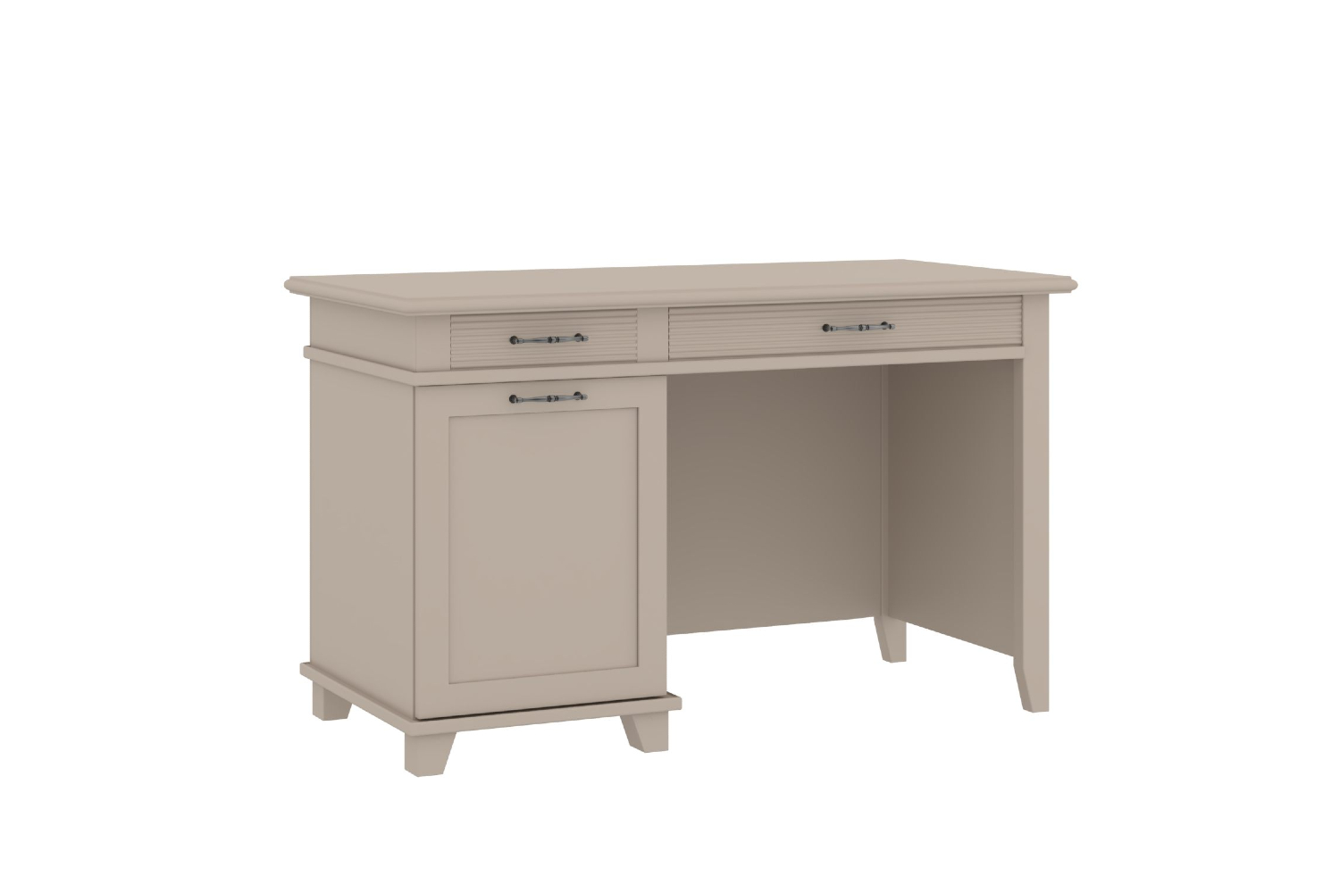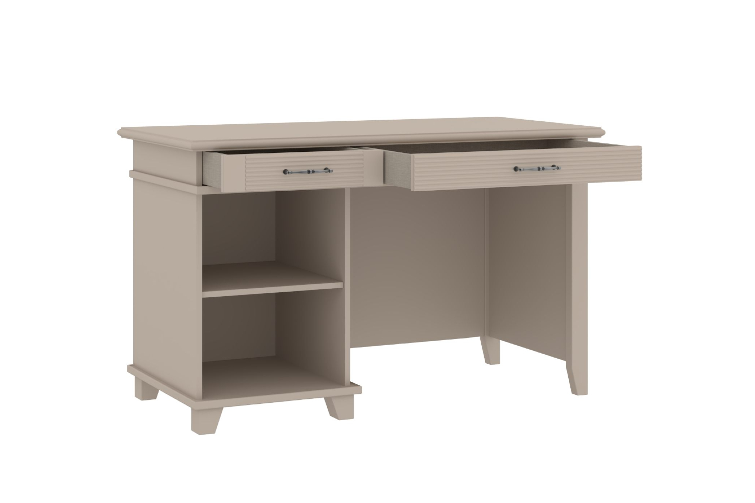 - Под столешницей — отделение с двумя выдвижными ящиками. На задней стороне стола — фальшпанели (с декоративными профилями), повторяющие внешний вид фасадов ящиков;