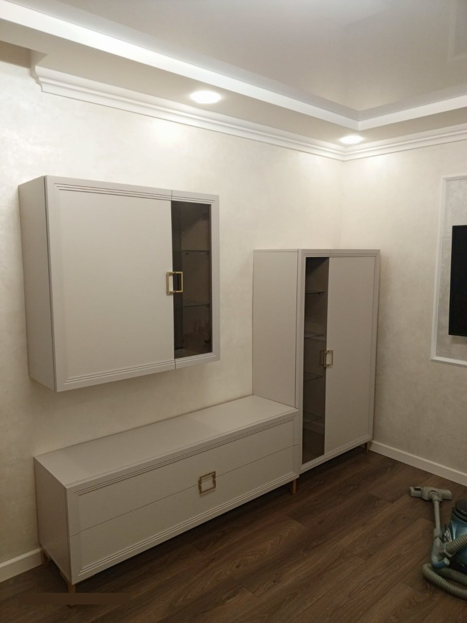 - Внутреннее наполнение: стеклополки 0,6 см за стеклянным фасадом и ЛДСП 1,6 см за глухим фасадом;