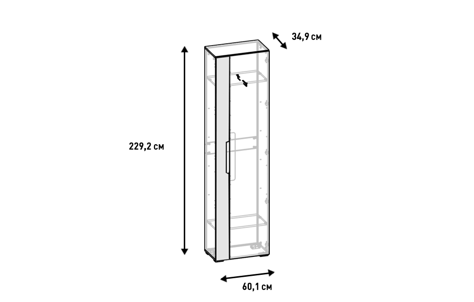 Прочные фасады из МДФ в ПВХ-пленке текстурированы под дерево «швейцарский вяз» и украшены вставкой базового белого цвета. Такое оформление зрительно вытягивает помещение в вертикальном направлении. Все детали облицованы кромочным материалом высокого качества, защищающим древесную плиту от порчи и расслоения. Внутри одностворчатый шкаф укомплектован евроштангой и двумя полками, по запросу покупателя могут быть установлены 4 полочки из ламинированной ДСП. В комплектацию входят крепеж и фурнитура.